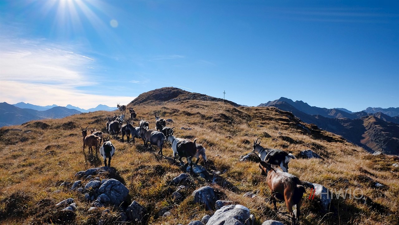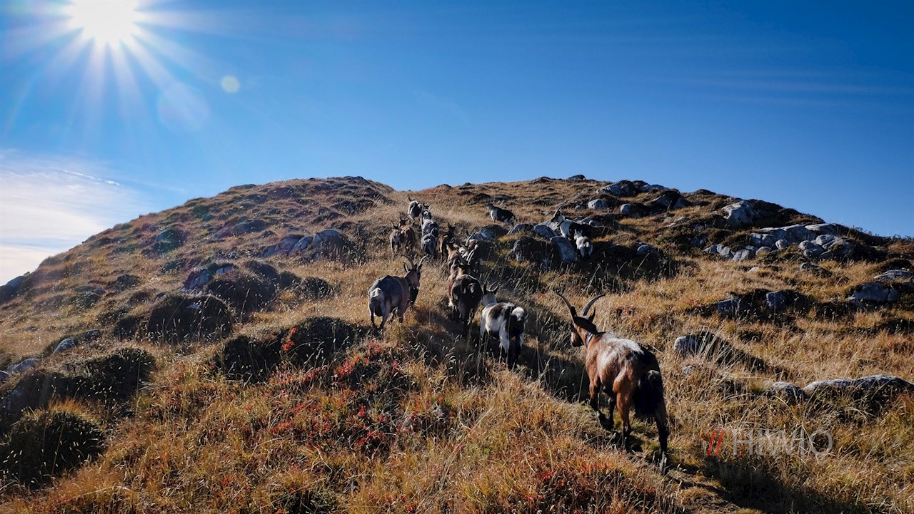 Hinter der Waldgrenze eröffnet sich ein berückender Panoramablick auf die ringsum aufragende Bergwelt. Nun folgt der sanftere Anstieg über den langgezogenen Bergrücken, der in der warmen Jahreszeit von unzähligen Bergblumen bestanden ist.
