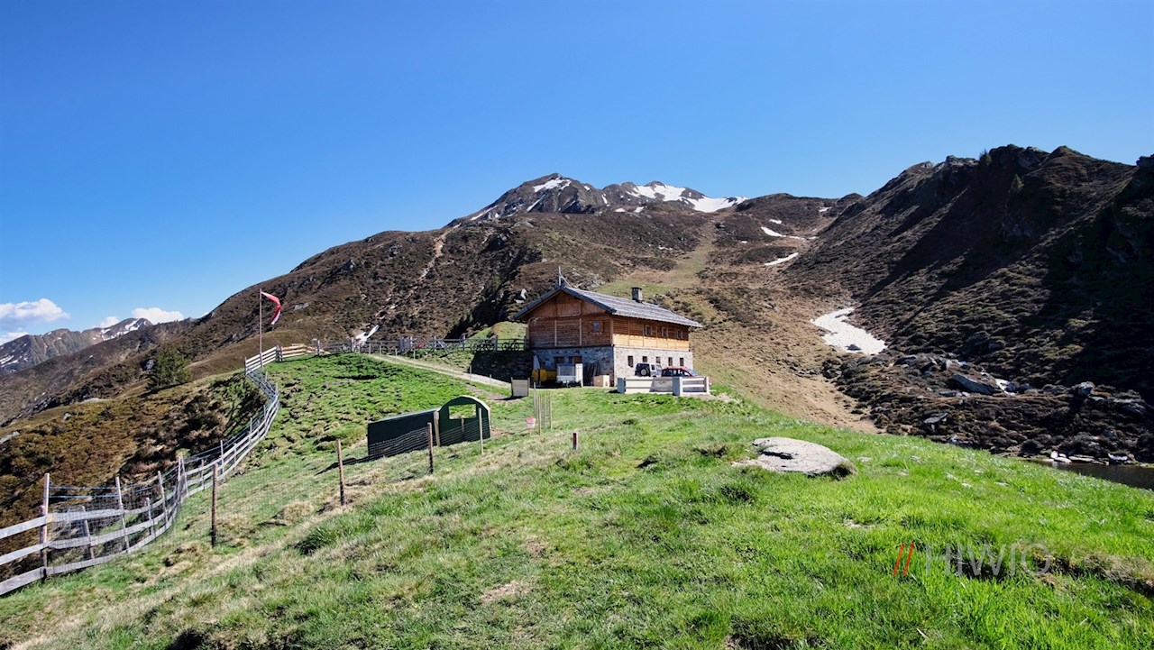 Kurz darauf weist am rechten Wegesrand ein Wanderschild auf den gut markierten Pfad Nr. 29. Er zieht sich im nunmehr etwas steileren Anstieg zur Waldgrenze, hinter der sich die idyllischen Wiesen der Gewingesalm ausdehnen. Die gewellten Bergwiesen stehen im malerischen Kontrast zu den ringsum aufragenden Bergspitzen, die den Wanderer in ihren Bann schlagen.