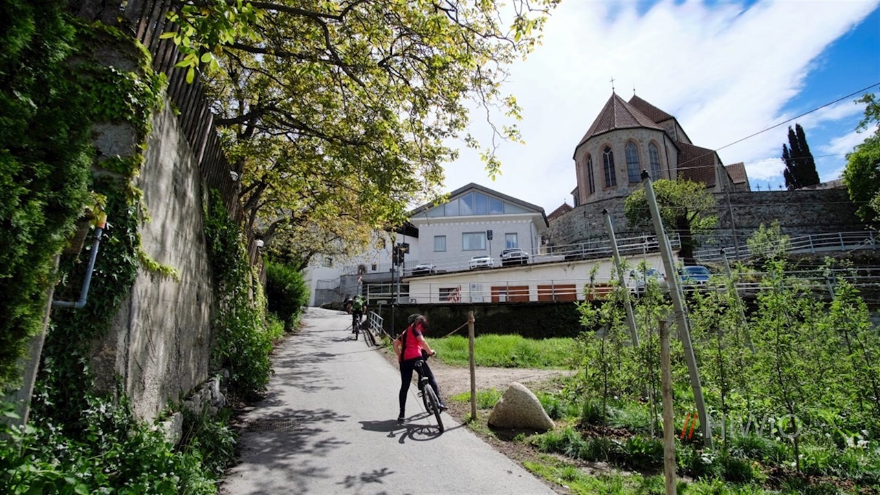 Schließlich geht der Weg wieder in ein asphaltiertes Sträßchen über, das direkt ins sonnenverwöhnte, von malerischen Obst- und Weinwiesen umrahmte Dorfzentrum mit seinen einladenden Cafés und Geschäften führt.