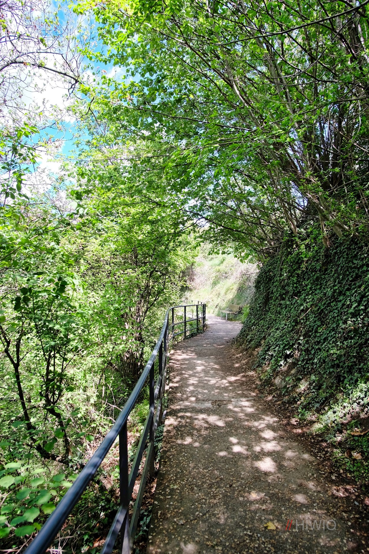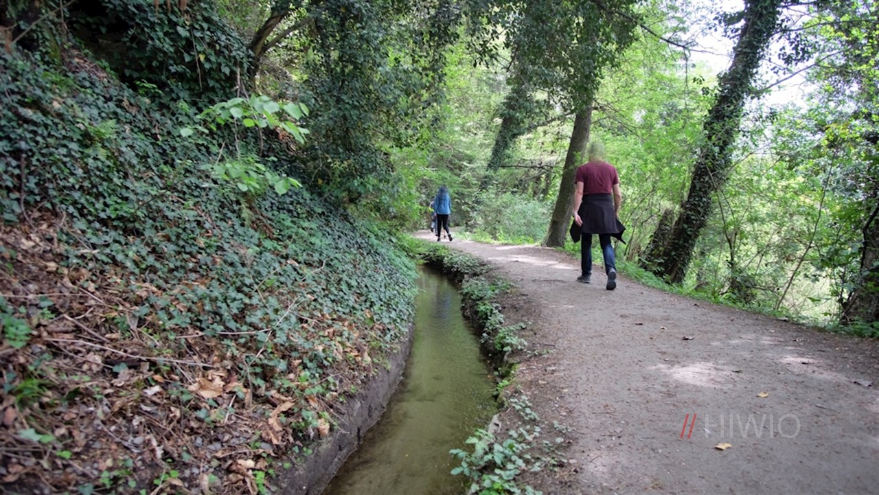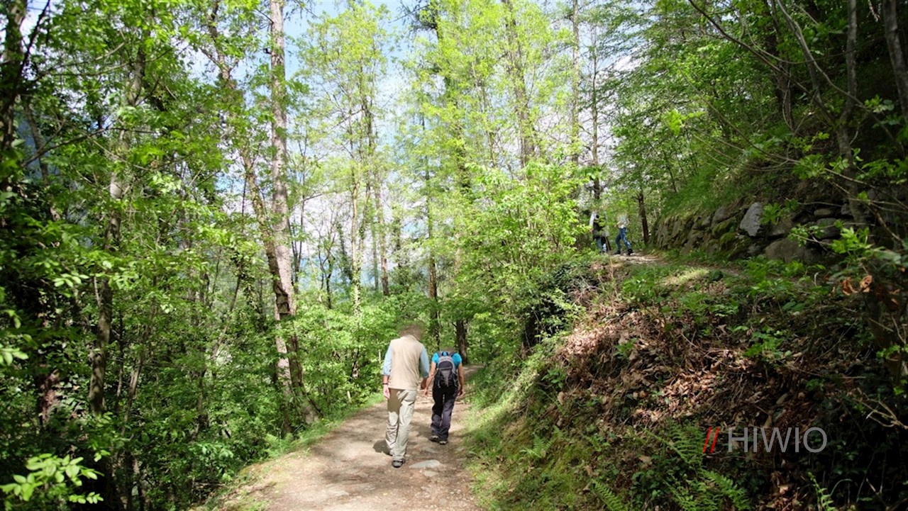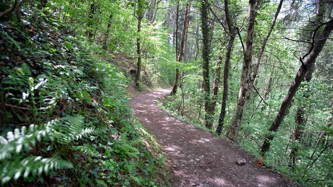 Wenig später weist ein mit der Nr. 1 markiertes Wegeschild den Weg zum Maiser Waalweg hinab. Dieser geht schließlich in einen schattenspendenden Waldweg über, der direkt in den beliebten Waalweg mündet.