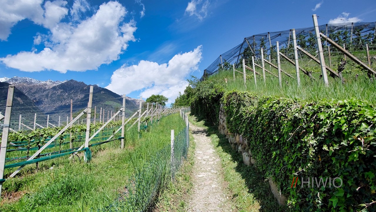 Schließlich zweigt am linken Straßenrand der Wanderweg Nr. 10A ab. Von malerischen Apfelwiesen umsäumt steigt er sanft nach Schenna an.
