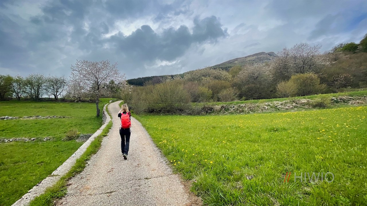 Hier weist das Wanderschild Nr. 608B den Anstieg auf den vor uns aufragenden Monte Stivo. Er folgt zunächst einem asphaltierten Sträßchen, das wenig später in einen breiten Wanderweg übergeht. Dieser schlängelt sich im steten Anstieg durch blumenreiche Wiesen und zunehmend dichter werdende Waldstücke.