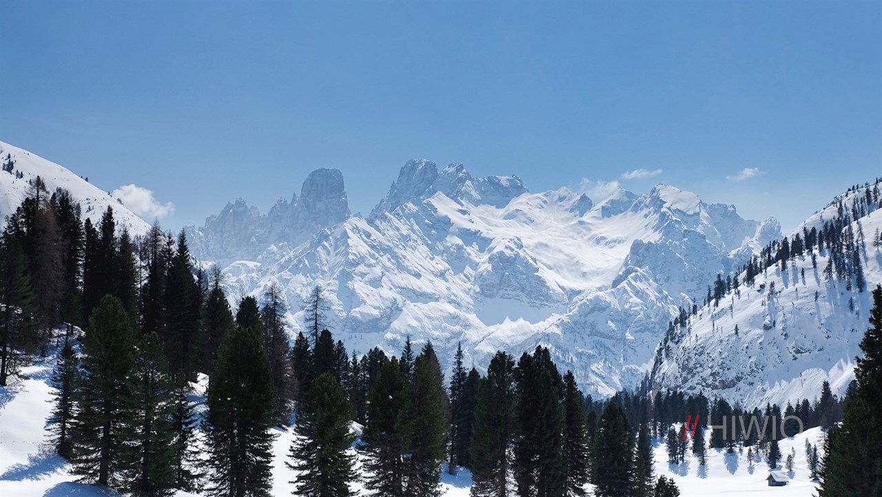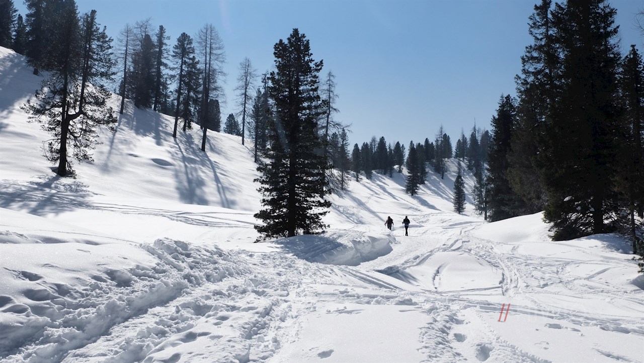 Kurz darauf gelangt man abermals an eine Weggabelung. Der Wegnummer 18 in Richtung Stolla Alm folgend, schlängelt sich der Wanderweg im angenehmen Anstieg durch lichten Winterwald und aussichtsreiche Lichtungen, in denen sich bereits schöne Ausblicke auf die umliegende Bergwelt entfalten.