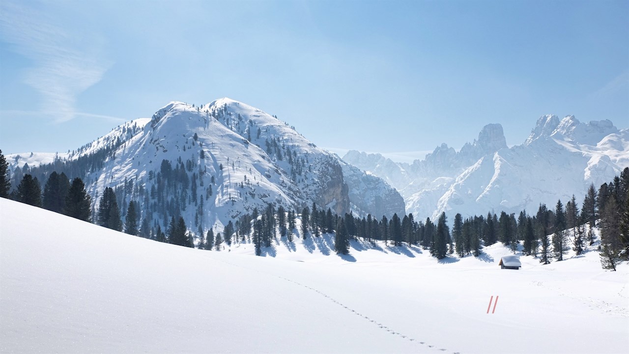 Hinter der idyllisch gelegenen Hütte geht die Wanderung in den Weg Nr. 3 über. Er führt vor malerischer Bergkulisse auf die nunmehr nahe Plätzwiese, der auch im Winter ein einzigartiger Zauber innewohnt.