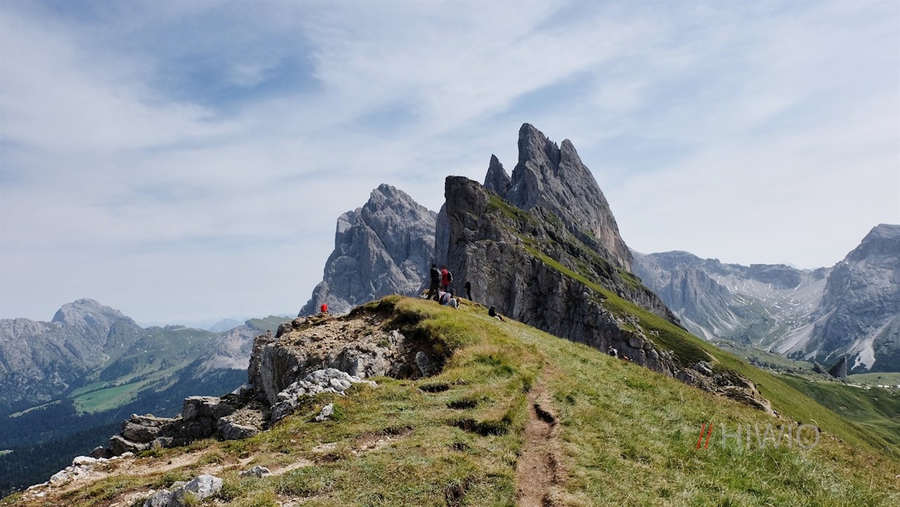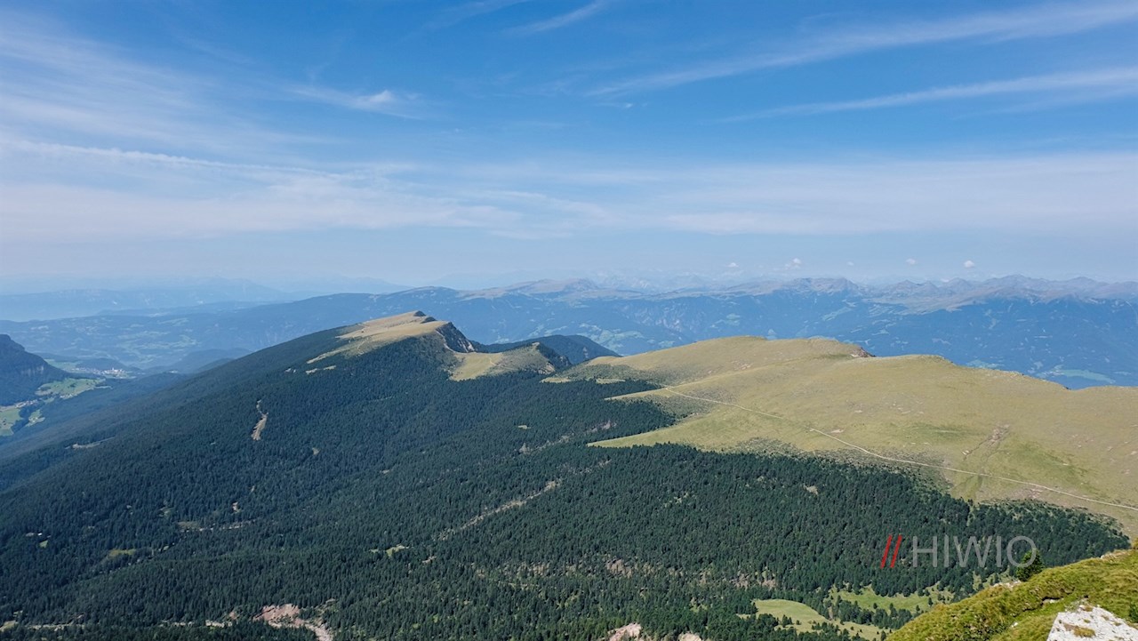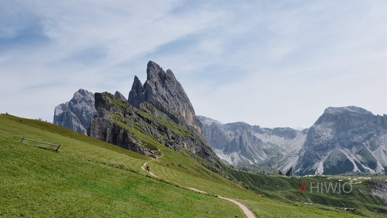 Schließlich erreicht man die Seceda, deren sanft geschwungene Weiden im starken Kontrast zum geröllreichen und felsigen Anstieg stehen. Hier werden die Mühen des Aufstiegs mit einem malerischen Panoramablick belohnt: Neben den eingangs erwähnten Geislern, schweift der Blick unter anderem über die Puezgruppe, den Sellastock, den Lang- und Plattkofel, den Rosengarten, die Raschötz und den Peitlerkofel.