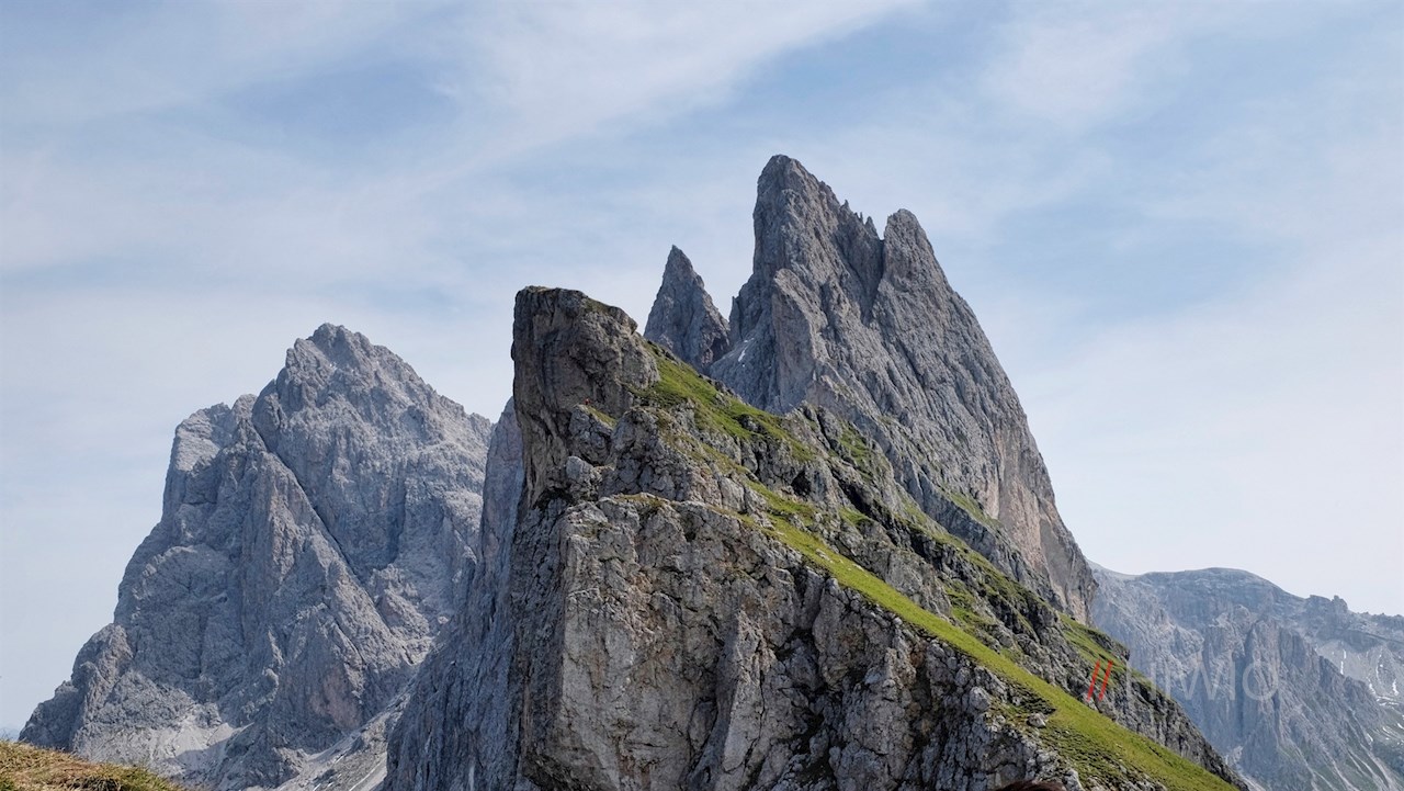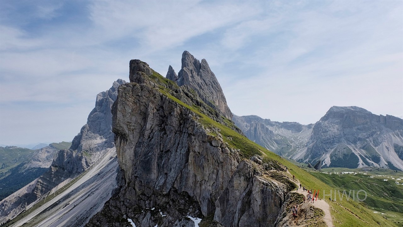 Der seitlich gerichtete Blick auf die anmutigen Spitzen der Villnösser Geisler von der Seceda zählt zu den beliebtesten und begehrtesten Fotomotiven in den Dolomiten. Die Seceda selbst kann man von St. Ulrich, vom Col Raiser, von St. Christina oder auf dem hier beschriebenen Weg über die Villnösser Panascharte besteigen.