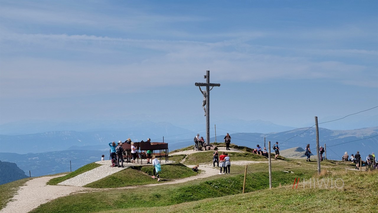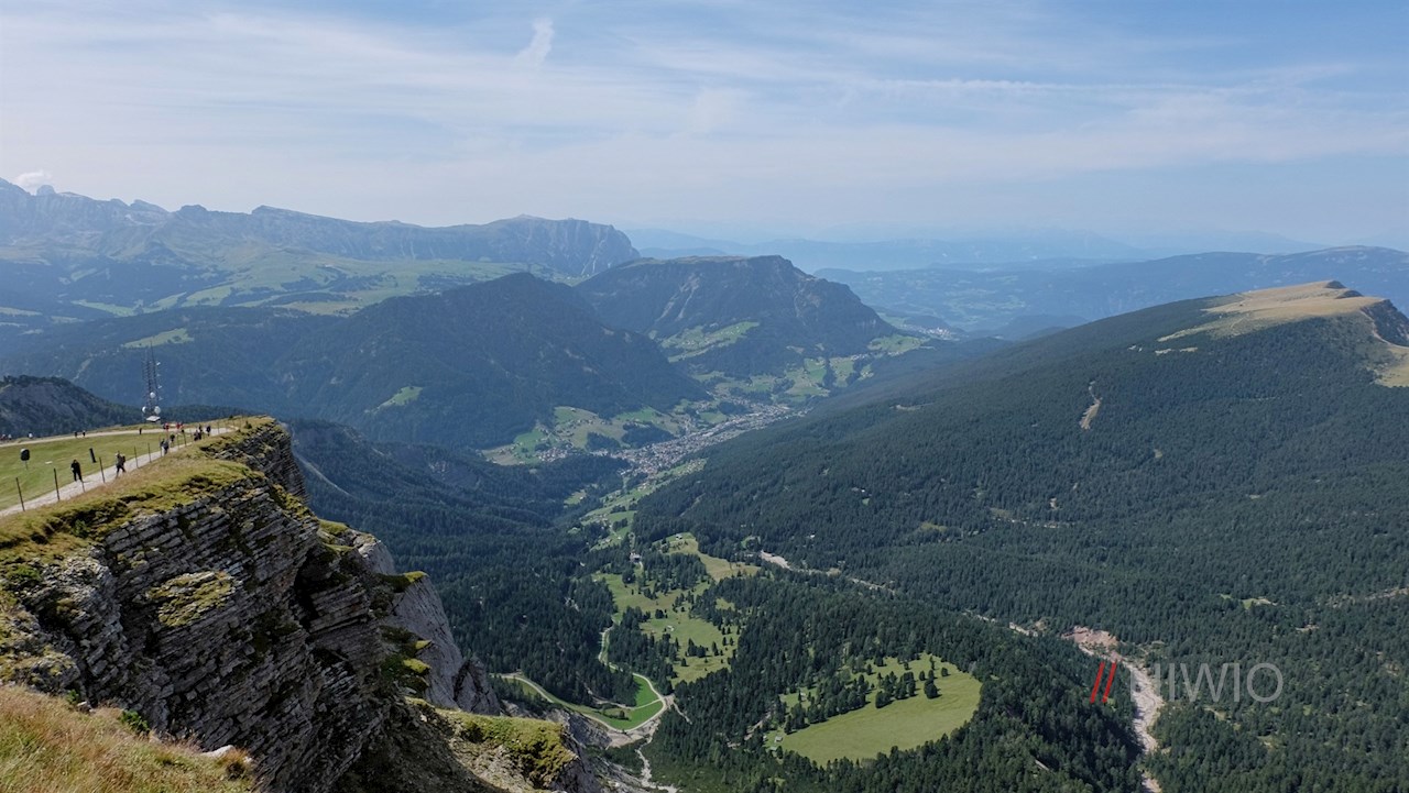 Wenngleich sich auf der Seceda zumeist zahlreiche Bergliebhaber tummeln, sollte man sich den Ausblick vom nahen Gipfelkreuz nicht entgehen lassen. Hierfür folgt man weiterhin dem Weg Nr. 6, der die sanften Weidehänge in Richtung Seilbahn quert. Neben dem anmutigen Gipfelkreuz gibt eine Panoramatafel Aufschluss über die Namen der zahlreichen Gipfel, die man von hier aus erblickt.