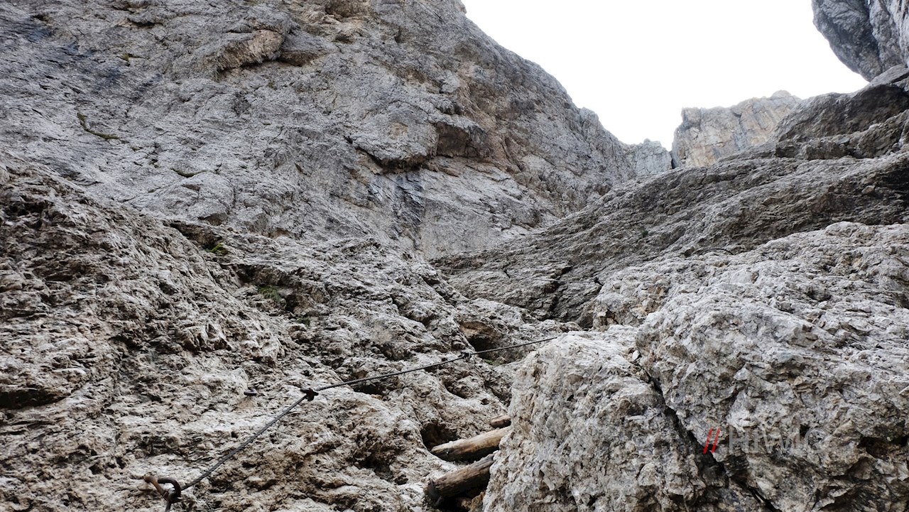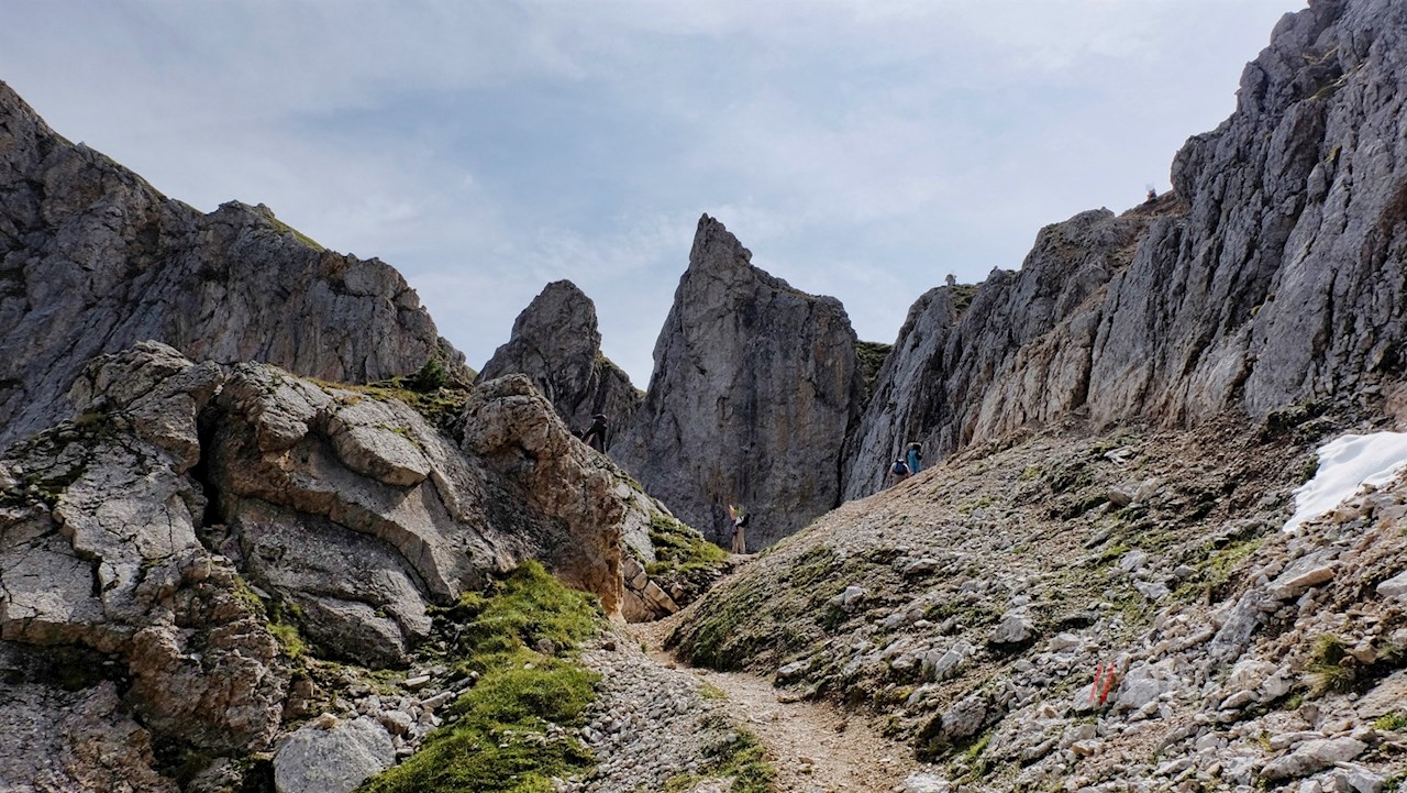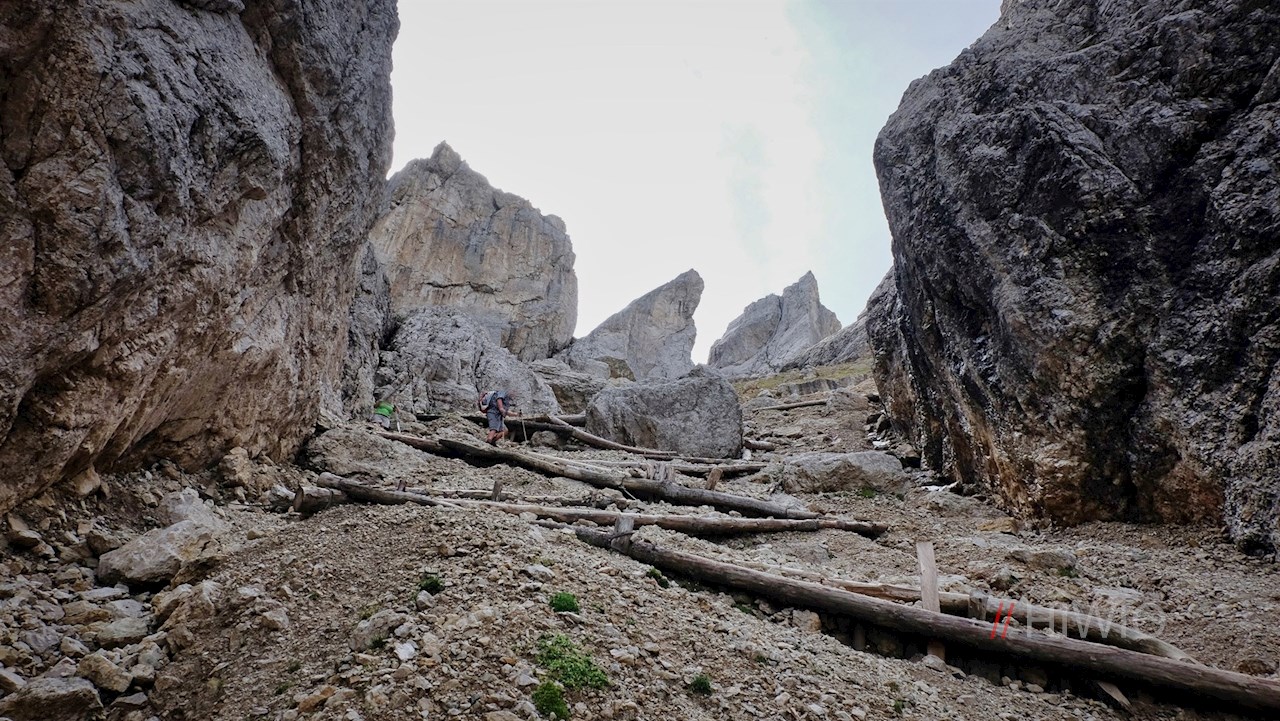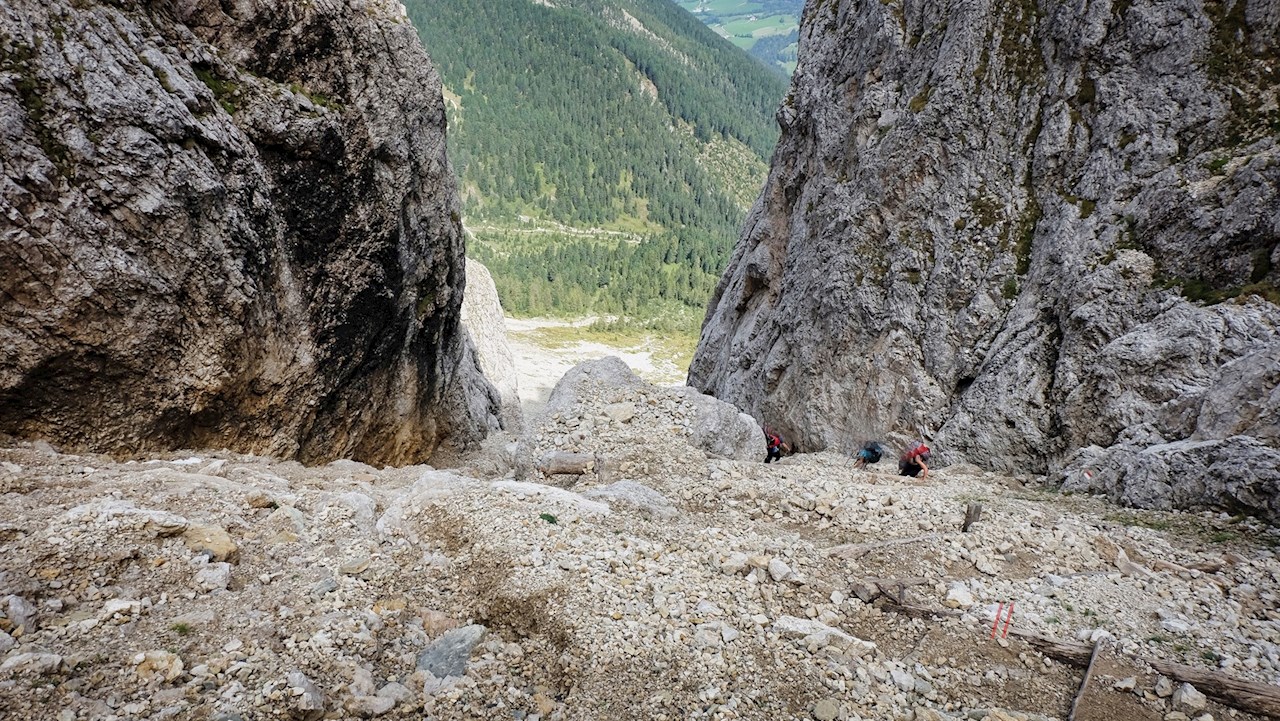 Alsbald aber führt er im nunmehr ziemlich steilen Anstieg in unzähligen Zick-Zack-Kehren über die schroffen Geröllhänge der Panascharte. Einige ausgesetzte Passagen sind mit Stahlseilen und Holzplanken gesichert und dadurch entschärft. Dennoch ist insbesondere hier Trittsicherheit gefragt.