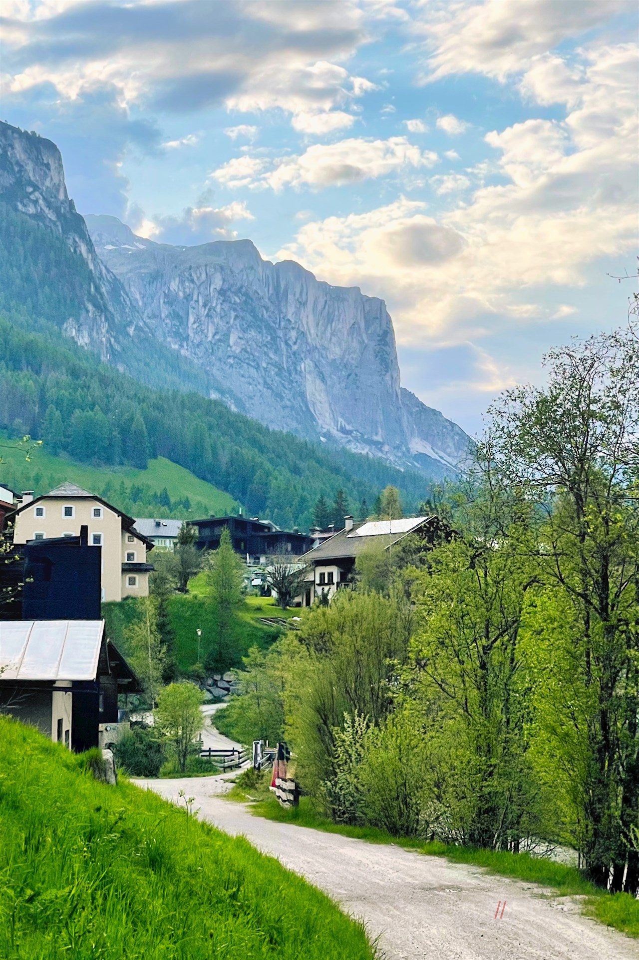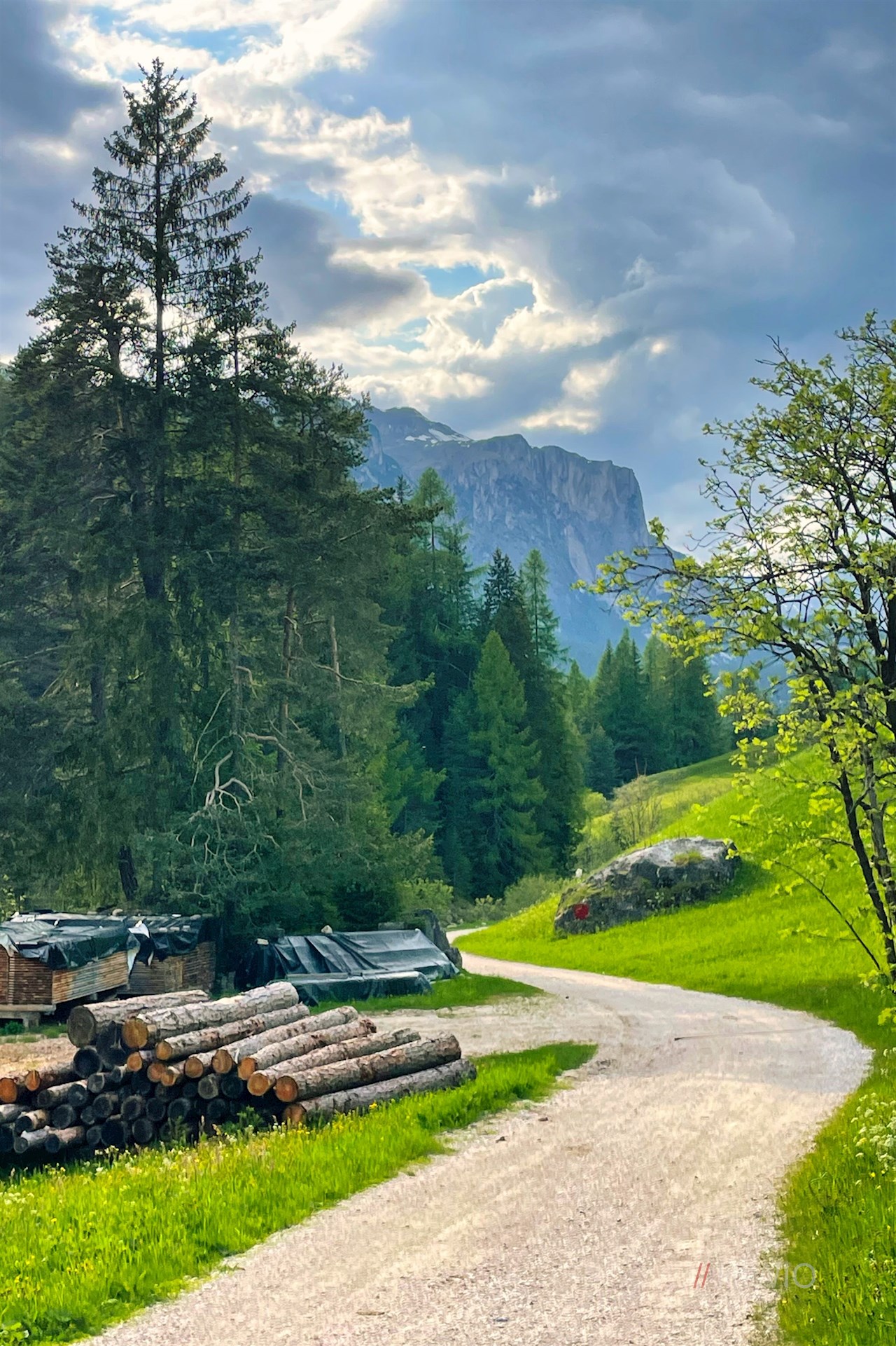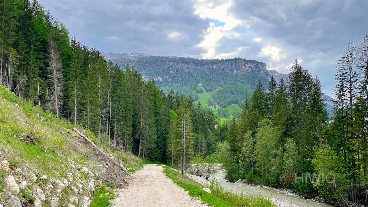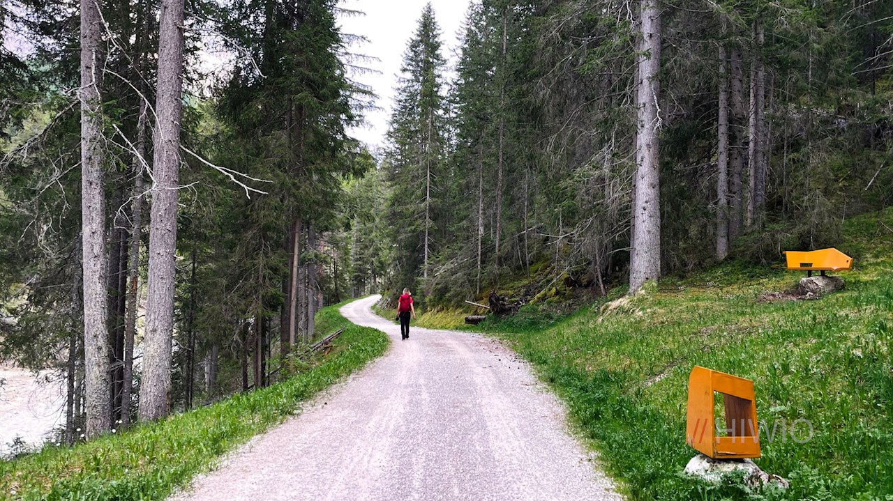 Der Wegnummer 11 in Richtung St. Kassian folgend, fällt der anfangs asphaltierte Weg zur Gader ab, an deren Ufern der Themenweg seinen eigentlichen Anfang nimmt.