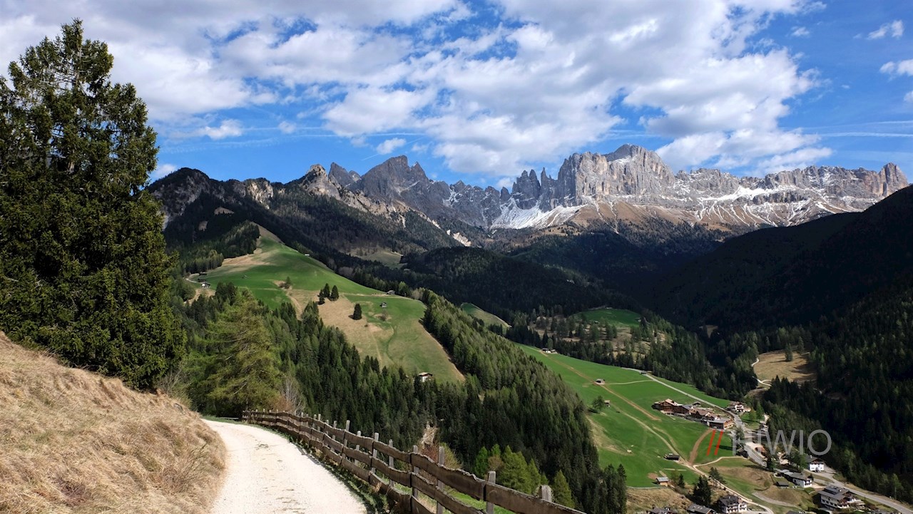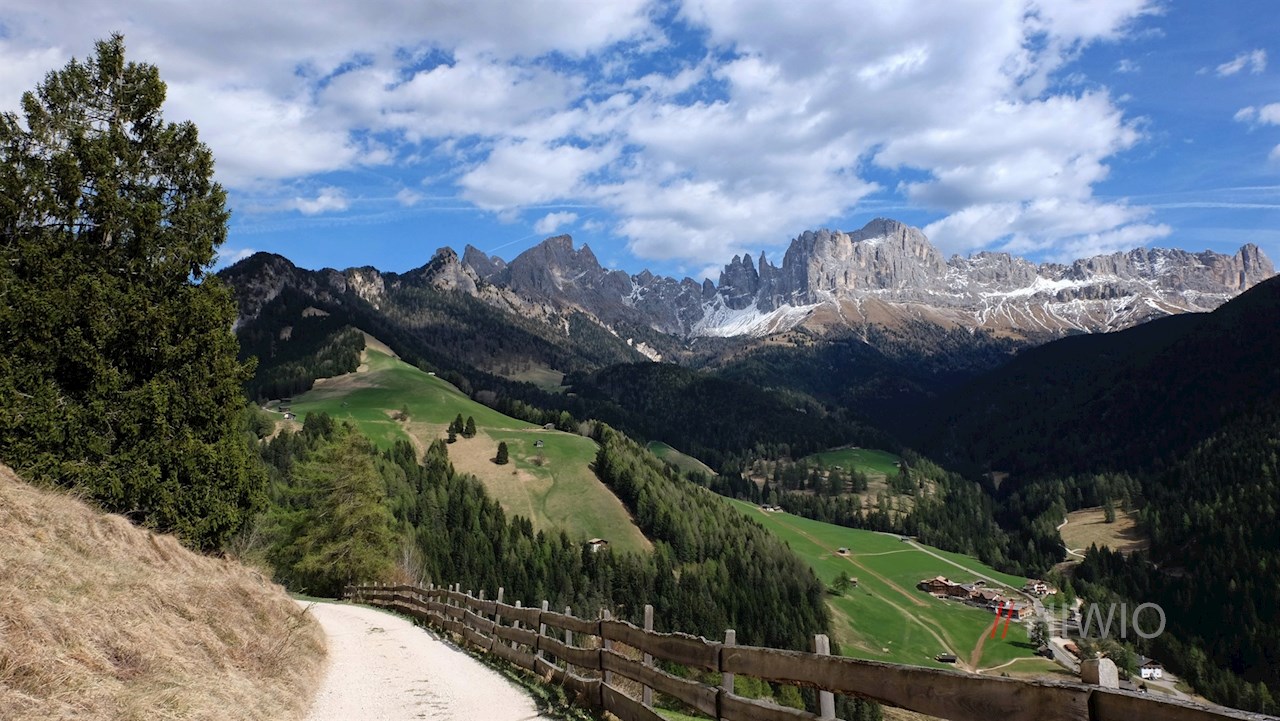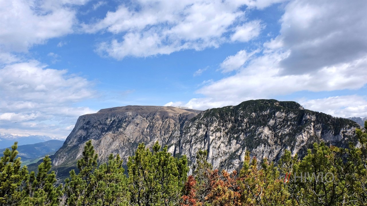 Nach etwa 40 Minuten gemütlichen Wanderns erreicht man den sog. Wuhnleger, eine weitläufige Weidewiese, in der sich ein malerischer Ausblick auf den Latemar und den Rosengarten entfaltet.