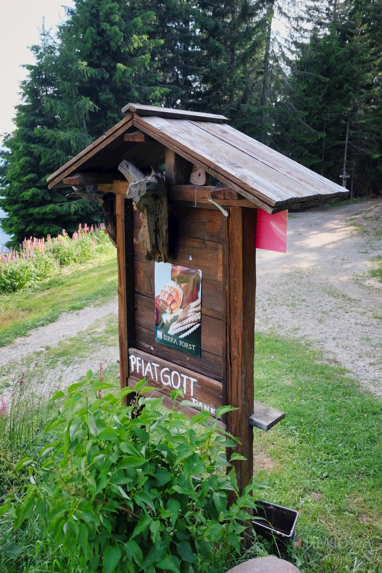 Wenig später geht das Sträßchen in einen breiten, schattenverheißenden Waldweg über. Er steigt sanft durch den lauschigen Nadelwald an, der ab und an Ausblicke auf den wuchtigen Schlern und den majestätischen Langkofel öffnet.