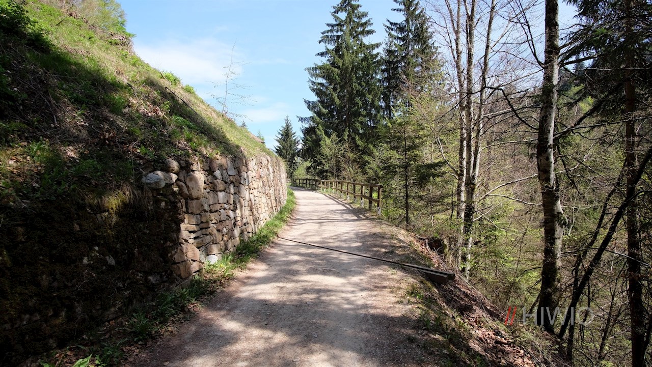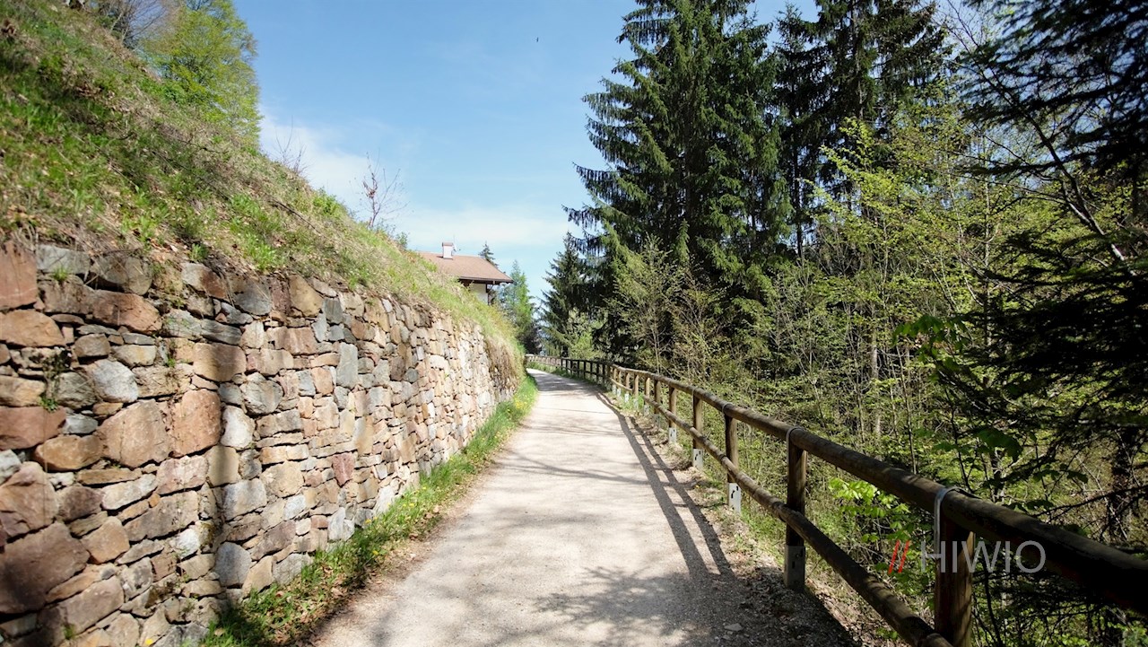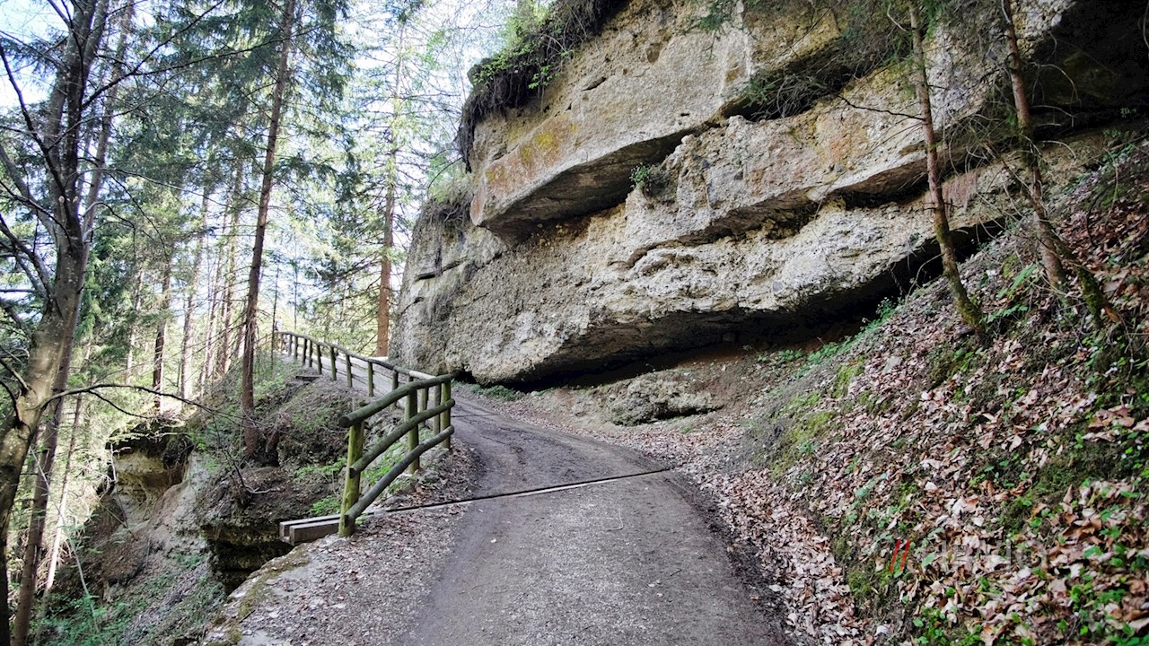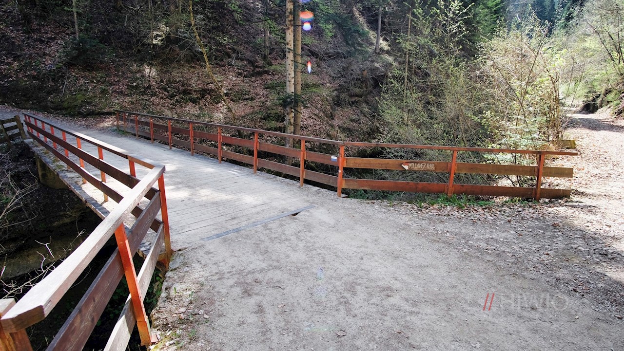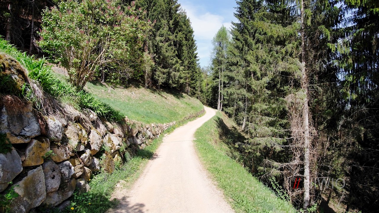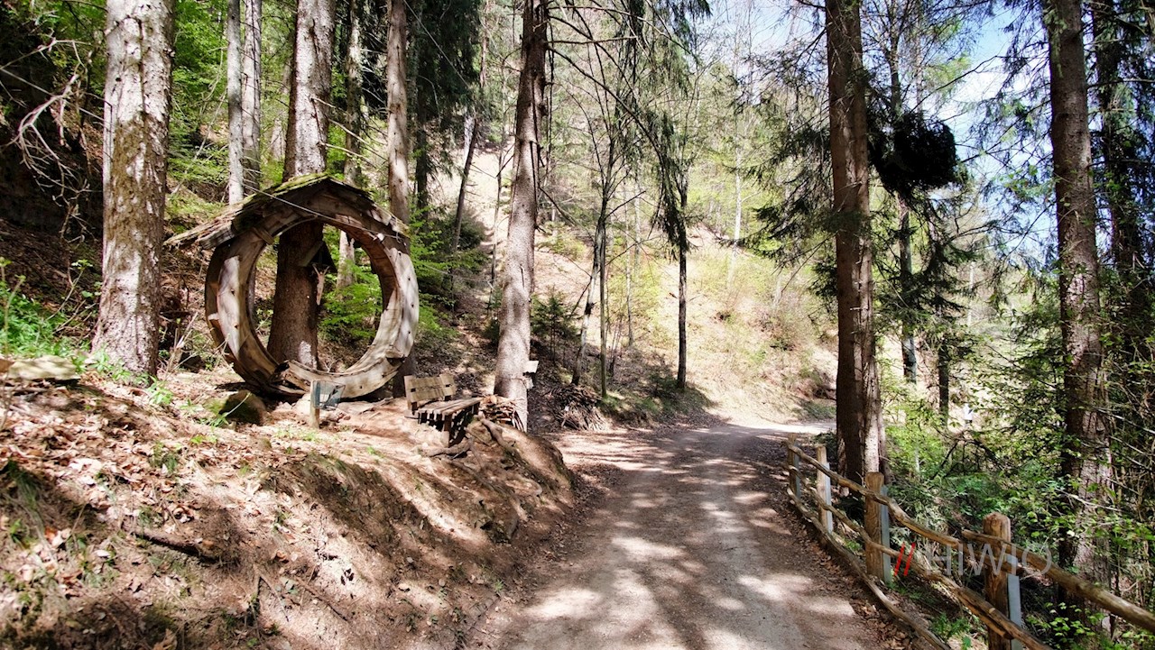 Hinter den letzten Höfen taucht der nunmehr teils ebene, teils sanft ansteigende Badlweg in einen schattenverheißenden Wald ein. Unterwegs kommt man an einem alten Mühlrad vorbei, überquert den Brandisbach und durchwandert eine bewaldete Schlucht.