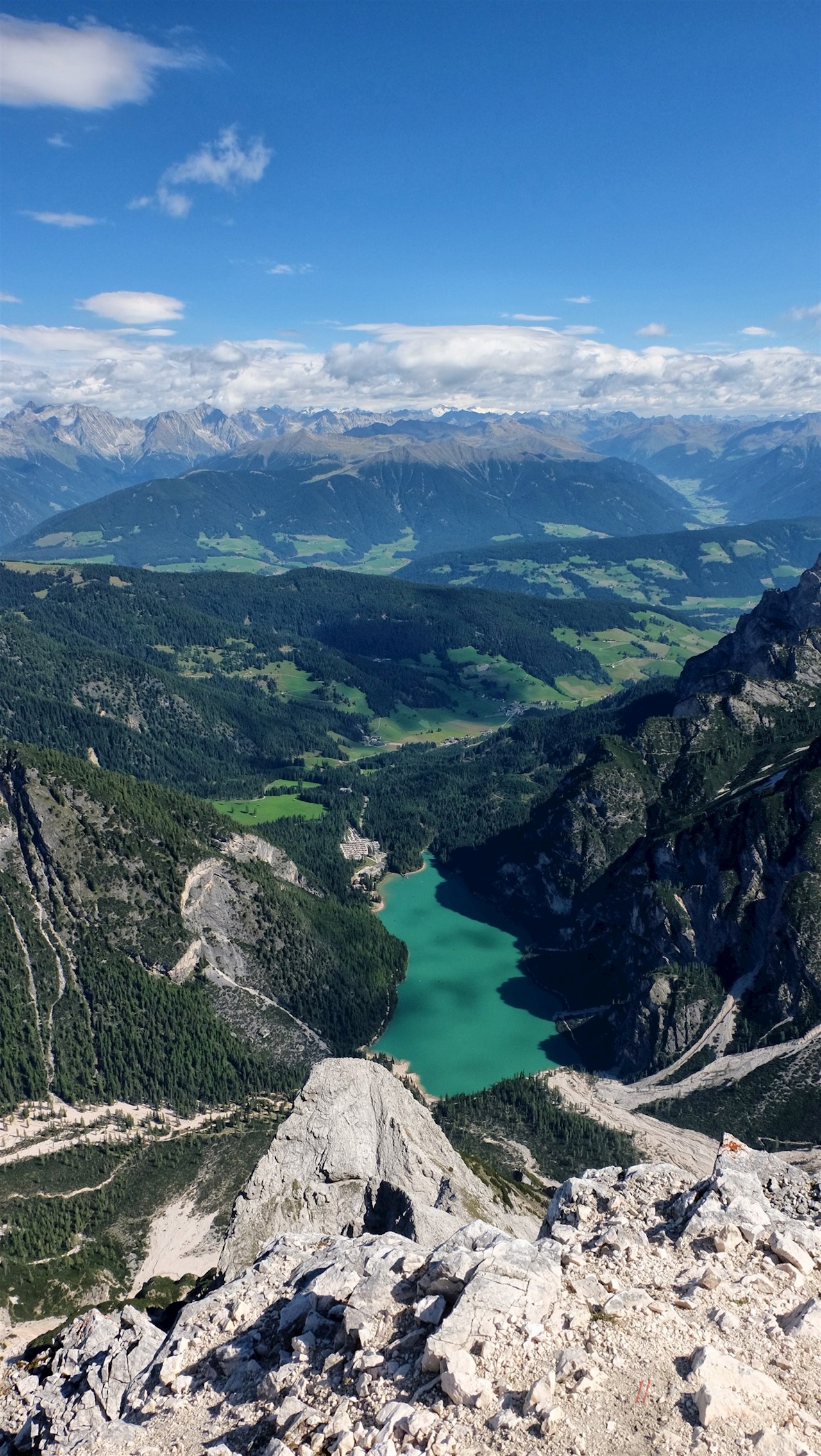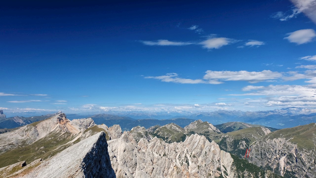 Genießt man bereits während des Anstiegs einen atemberaubenden Ausblick, eröffnet sich auf dem 2.810 m hohen Gipfel ein wahrlich unvergessliches Panorama: Im Norden ragen die Rieserferner Gruppe und die mächtigen Dreitausender der Zillertaler Alpen, im Osten die weltberühmten Drei Zinnen, im Süden die Lavarella und die Marmolada und im Westen der Puez und der Peitlerkofel in die Höhe. Gleichermaßen imposant ist der Tiefblick auf den schimmernden Pragser Wildsee.