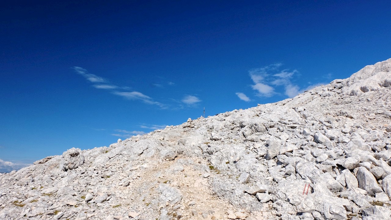 Nun folgt der steile Anstieg über die geröll- und steinbeschlagene Südostflanke des markanten Seekofel. Wenngleich er nicht markiert ist, ist der Weg leicht zu finden. Unterwegs trifft man auf eine Stahlkette, welche den Aufstieg über eine recht steile Passage erleichtert.