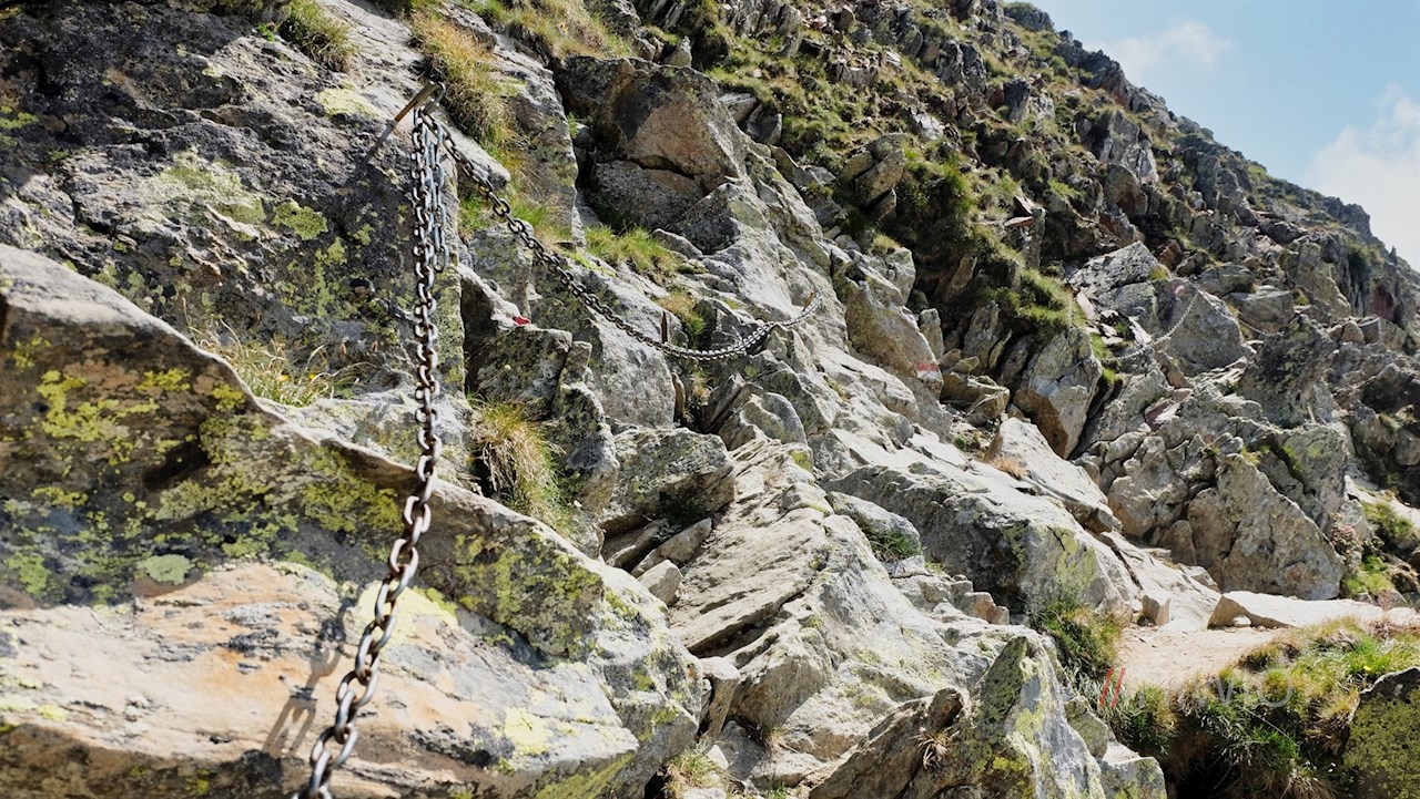 Dahinter windet sich der nunmehr sanfter ansteigende Weg durch teils felsendurchsetztes, ausgesetztes und abschüssiges Gelände an weiteren kleinen Bergseen vorbei. Außerdem trifft man auf einen weiteren seilgesicherten Abschnitt. Schließlich beginnt der recht steile Anstieg über die schrofige, von zarten Alpenblumen bewachsene Gipfelflanke der Eidechsspitze.