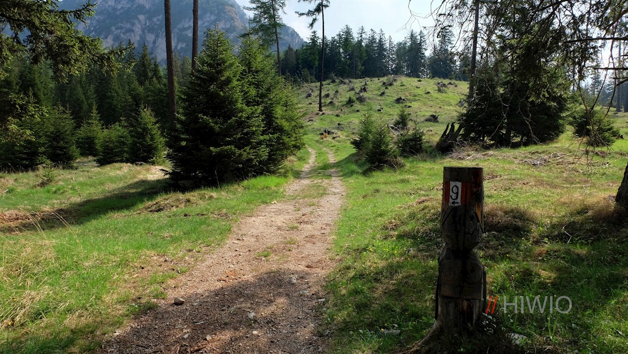 Kurz vor der Hütte zweigt rechts der breite Weg Nr. 9 ab. Er schlängelt sich zunächst nahezu eben in Richtung Hammerwand und geht alsbald in einen schmaleren Pfad über. Zwischen Alpenrosen und Latschenkiefern windet sich dieser ziemlich steil nach oben.