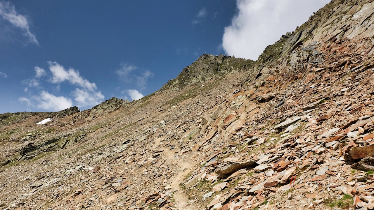 Dahinter steigt er steil über schiefrige Platten und Schutt in Richtung des aussichtsreichen Gipfels an. Zuletzt gilt es noch, die kantige Gipfelflanke zu überwinden, wofür man teilweise die Hände zu Hilfe nehmen muss.