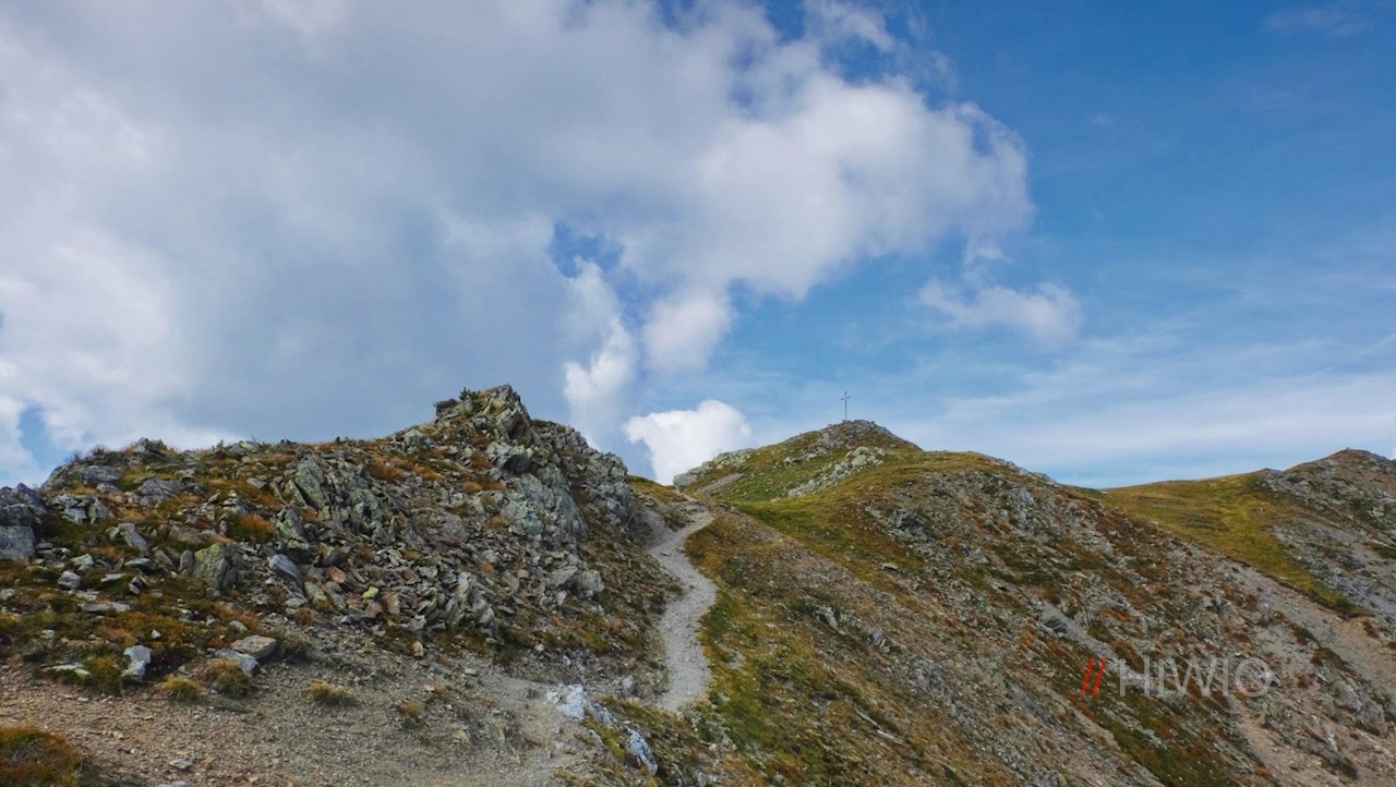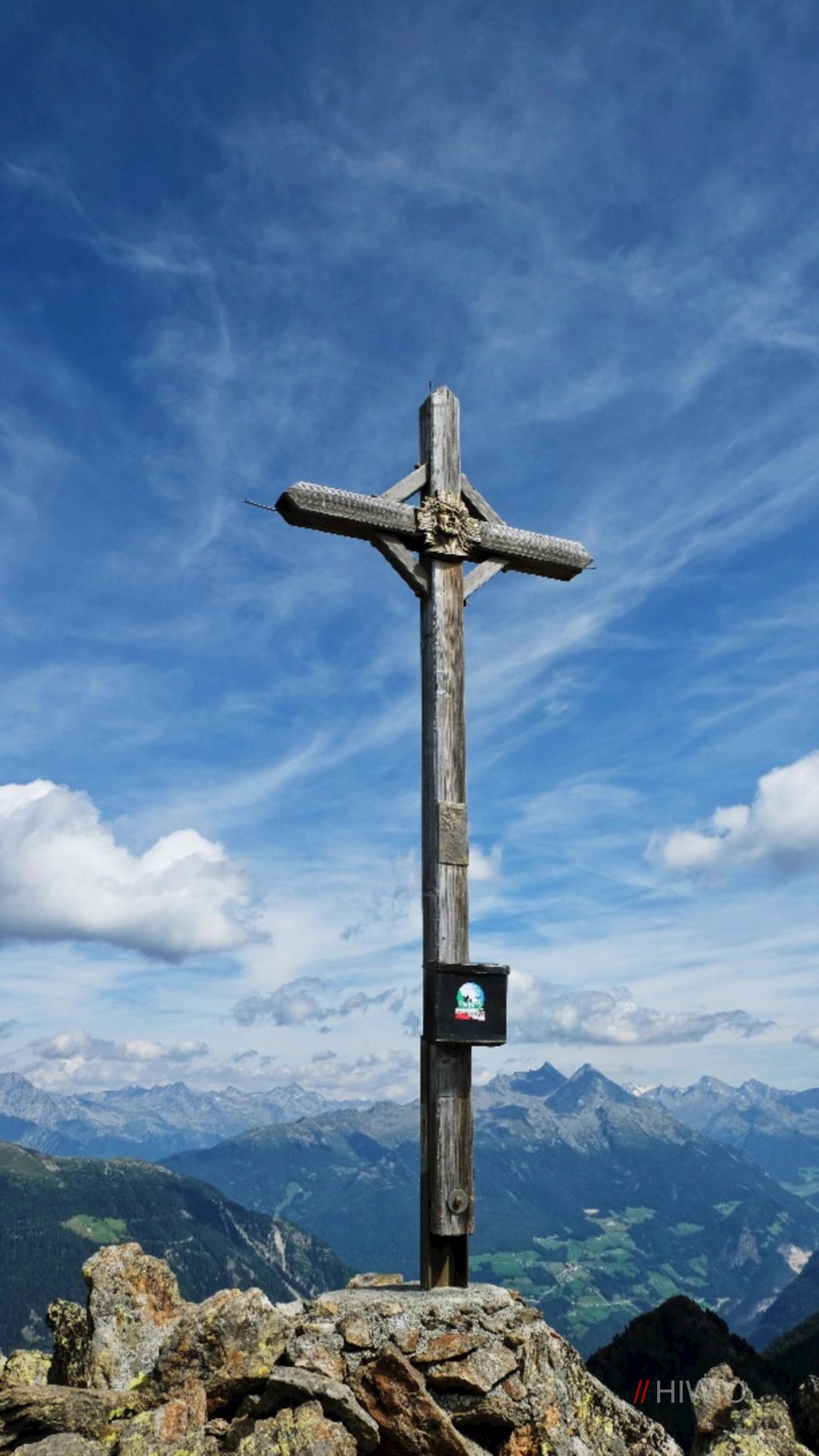 Neben dem schlichten Gipfelkreuz der Plattnerspitze entfaltet sich ein spektakulärer Panoramablick auf den Alpenhauptkamm und die lauschigen Plattner Seen.