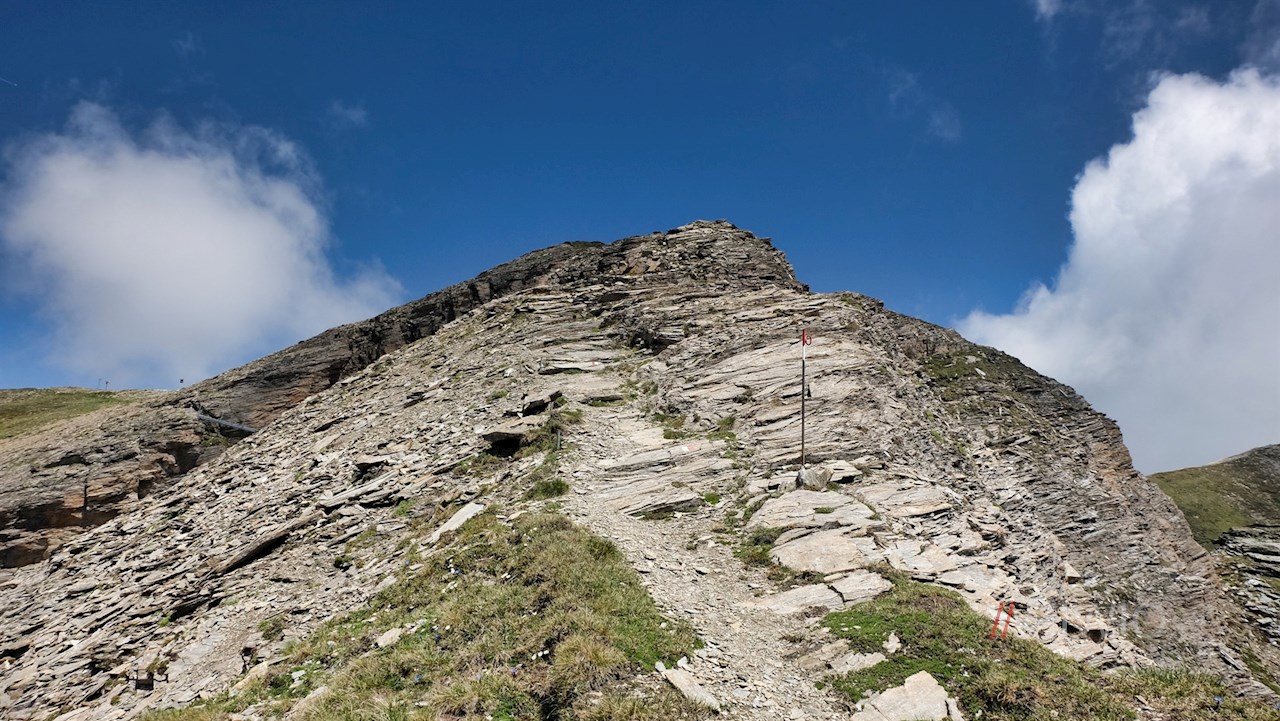 Nach der wohlverdienten Gipfelrast wandert man nordwärts über einen leicht ausgesetzten Grat in Richtung der benachbarten Amthorspitze, deren Gipfelkreuz bereits sichtbar ist. Dieser Weg erfordert allerdings etwas Trittsicherheit, zumal er zunächst über die felsige Gipfelflanke und später über einen schiefrigen, leicht ausgesetzten Grat führt. Außerdem gilt es, eine seilgesicherte Passage und eine Leiter zu überwinden, die auf einen Gitterroststeg führt.
