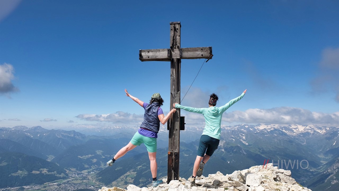 Nun ist die Rollspitze nicht mehr fern, die man auf durchwegs ausgesetzten Wegen erklimmt. Am Gipfelkreuz wird man dafür mit einem wahrlich malerischen Ausblick auf die Stubaier Alpen, die Zillertaler Alpen, das Karwendel und die Dolomiten belohnt. Sogar die Ortlergruppe ist in der Ferne auszumachen.
