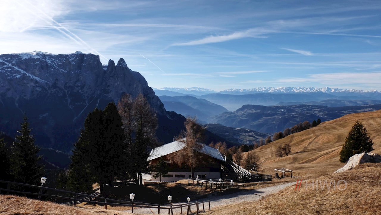 Alsbald tritt man aus dem Wald heraus und erblickt auch schon den Sessellift des Schutzhauses Monte Piz auf der Seiser Alm. Weiterhin der Markierung Nr. 3 folgend, wandert man auf nahezu ebenen Wegen zur Siedlung Kompatsch weiter.