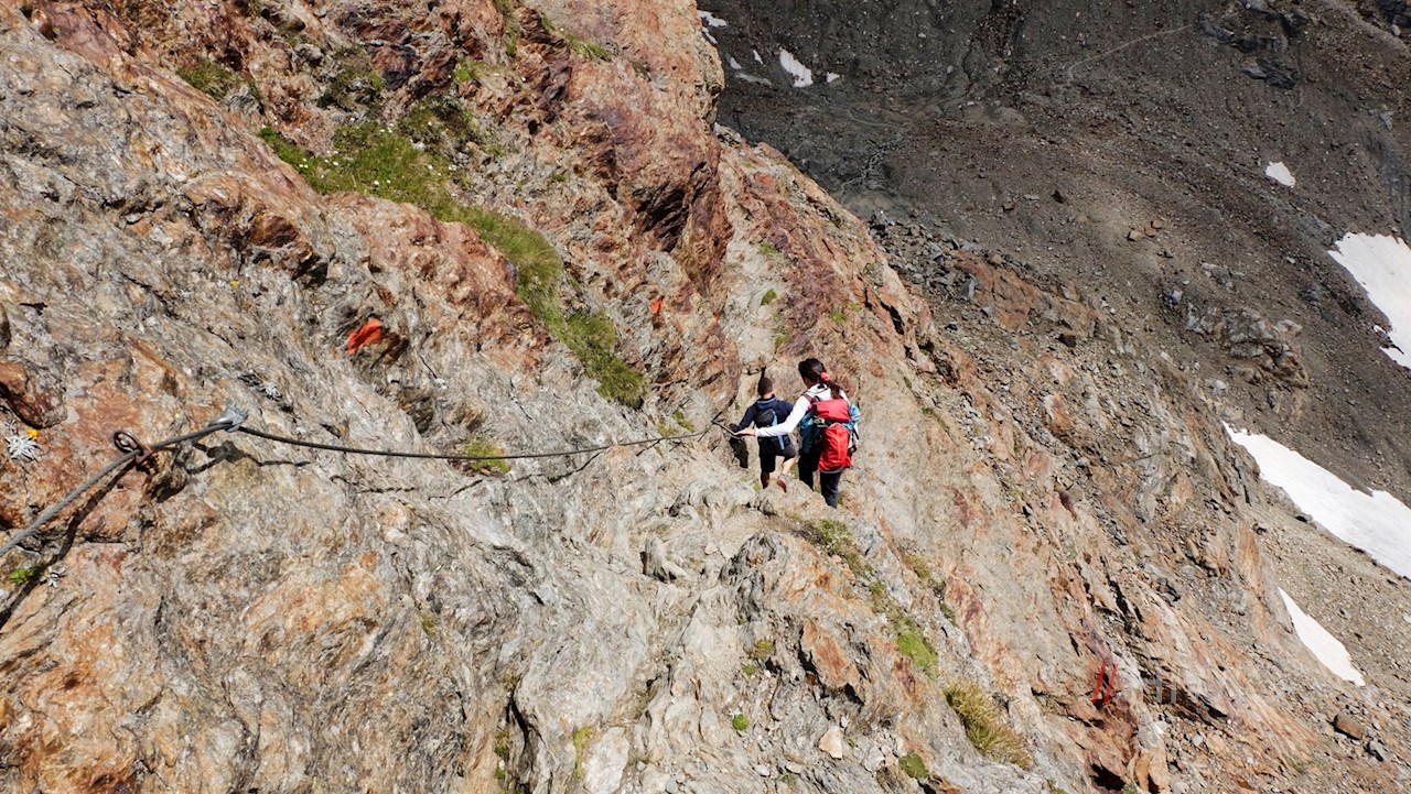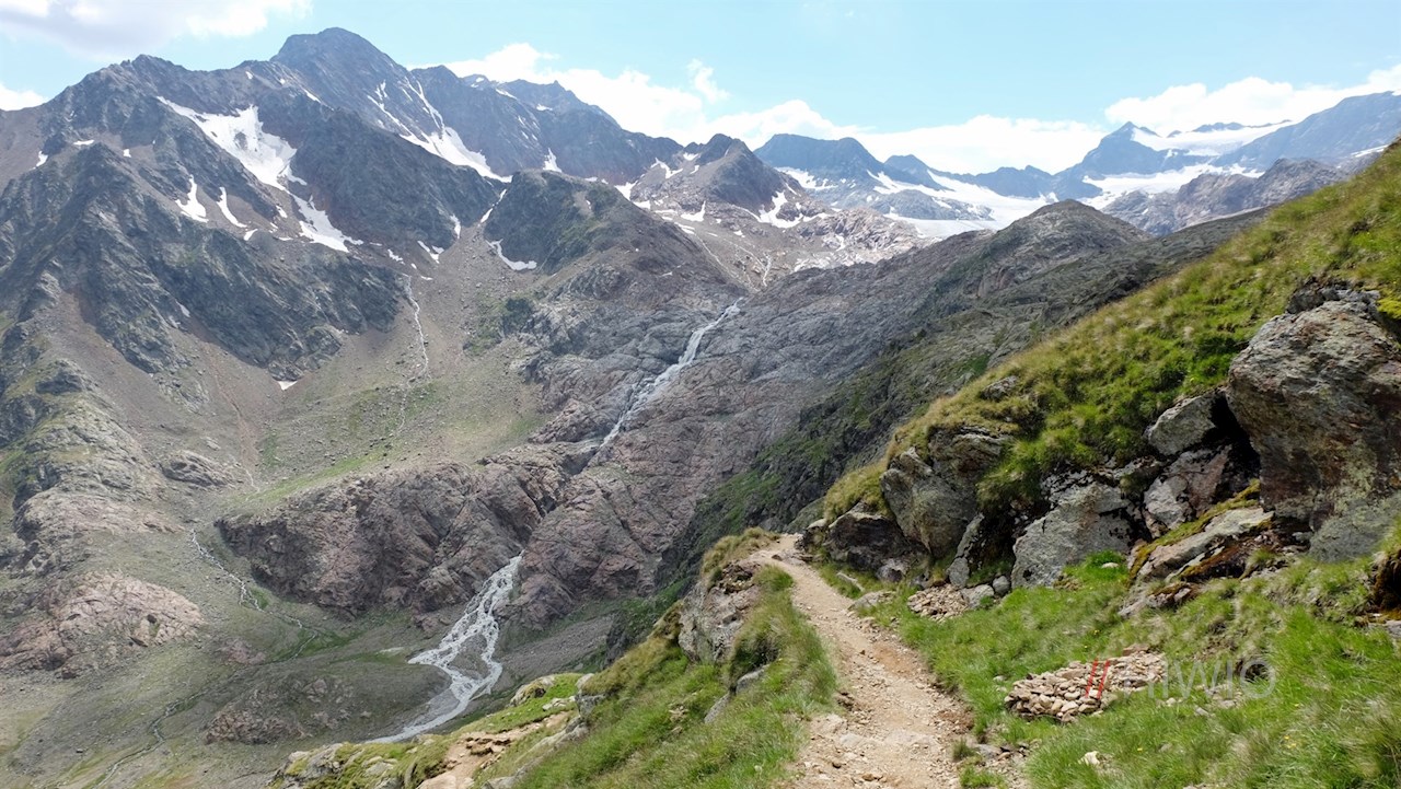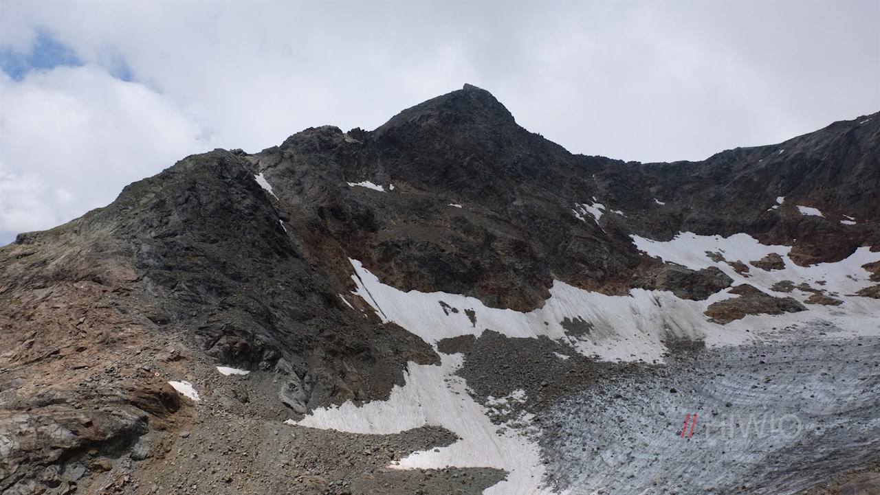 Nahe dem milchig trüben, unergründlich tiefen Übeltalsee steigt der Weg abermals steiler über Moränen und den spaltenlosen Seitenarm des Übeltalferners zur Becher-Südflanke an. Unterwegs trifft man auf einige gesicherte Passagen, die Trittsicherheit erfordern.