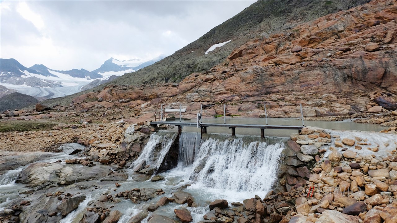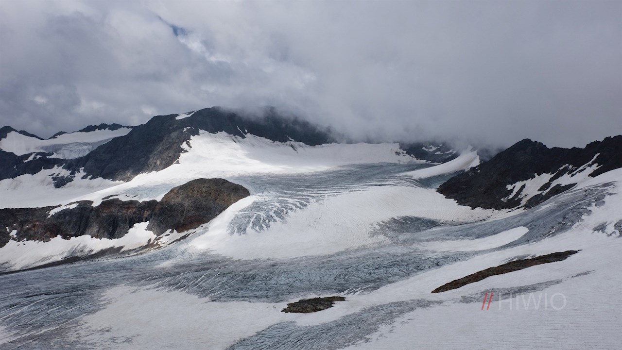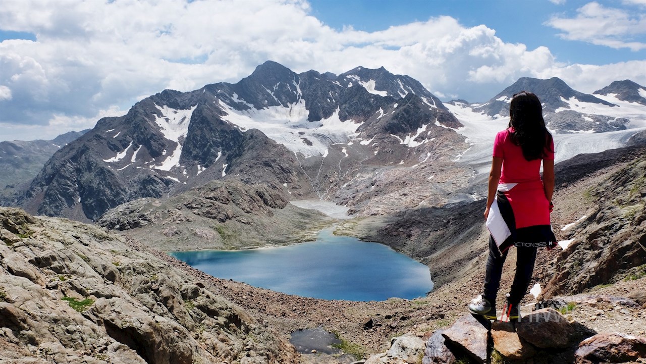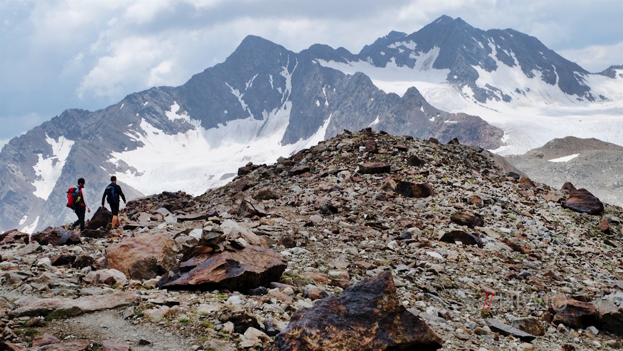 Nahe dem milchig trüben, unergründlich tiefen Übeltalsee steigt der Weg abermals steiler über Moränen und den spaltenlosen Seitenarm des Übeltalferners zur Becher-Südflanke an. Unterwegs trifft man auf einige gesicherte Passagen, die Trittsicherheit erfordern.