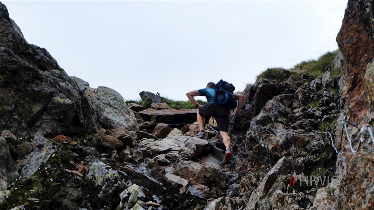 Zuletzt folgt der kräftezehrendste Teil der Wanderung: der Aufstieg über die unzähligen, steil in den Felsgrat geschlagenen Steinstufen zum Becherhaus, der durch zahlreiche Seile gesichert ist.