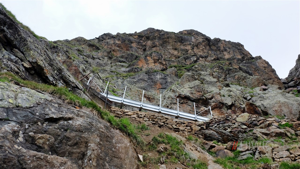 Nahe der Hütte rückt bereits die nächste Einkehrmöglichkeit ins Blickfeld: die auf einem steilen Felsvorsprung thronende Teplitzer Hütte, zu der sich der schmale Pfad nun ziemlich steil nach oben windet. Einige leicht ausgesetzte Passagen wurden durch eine Stahlbrücke und eine Seilsicherung entschärft.