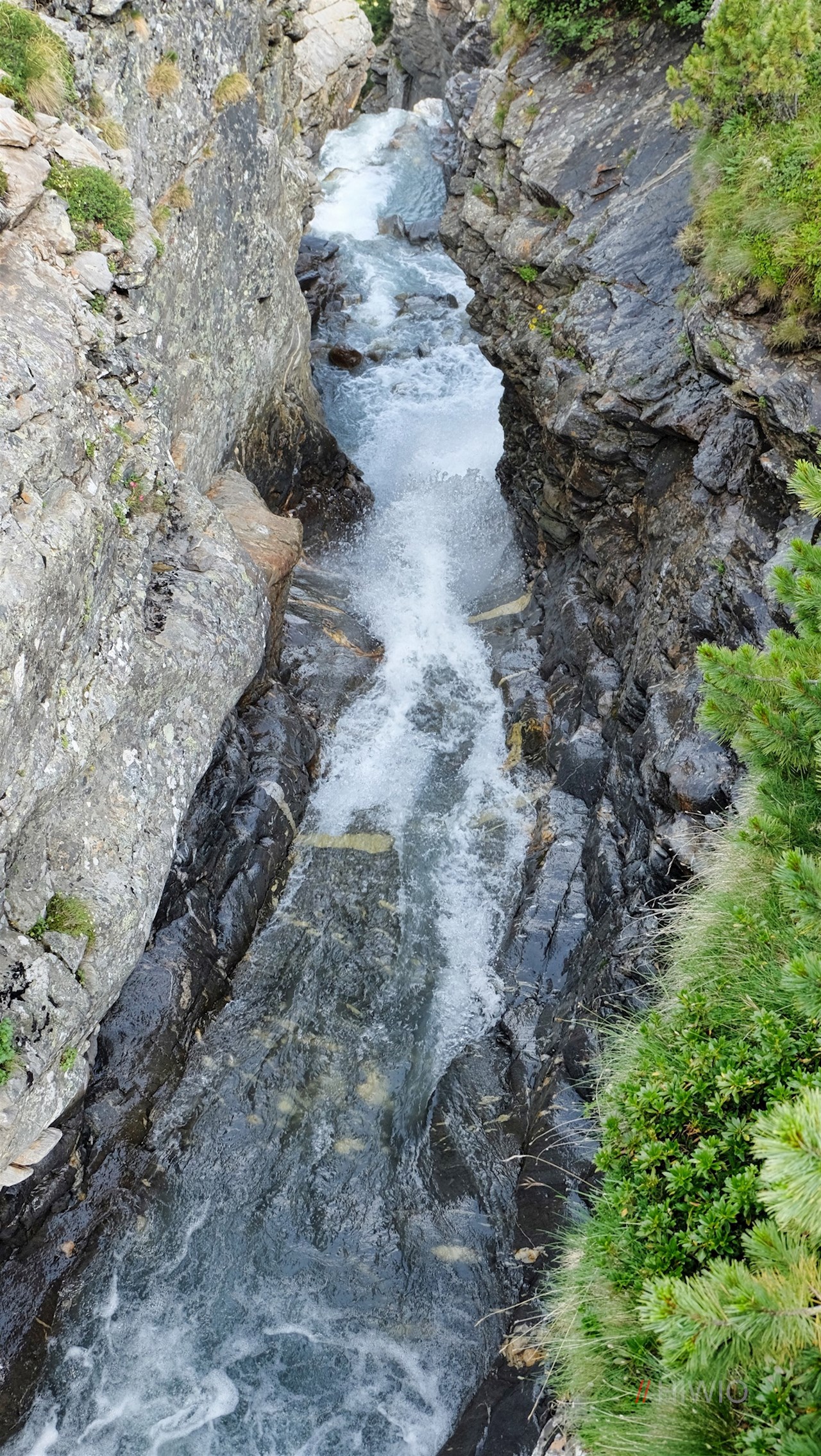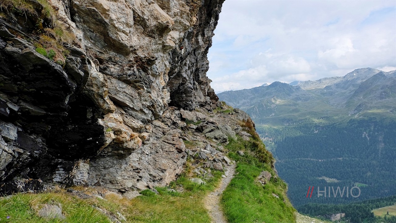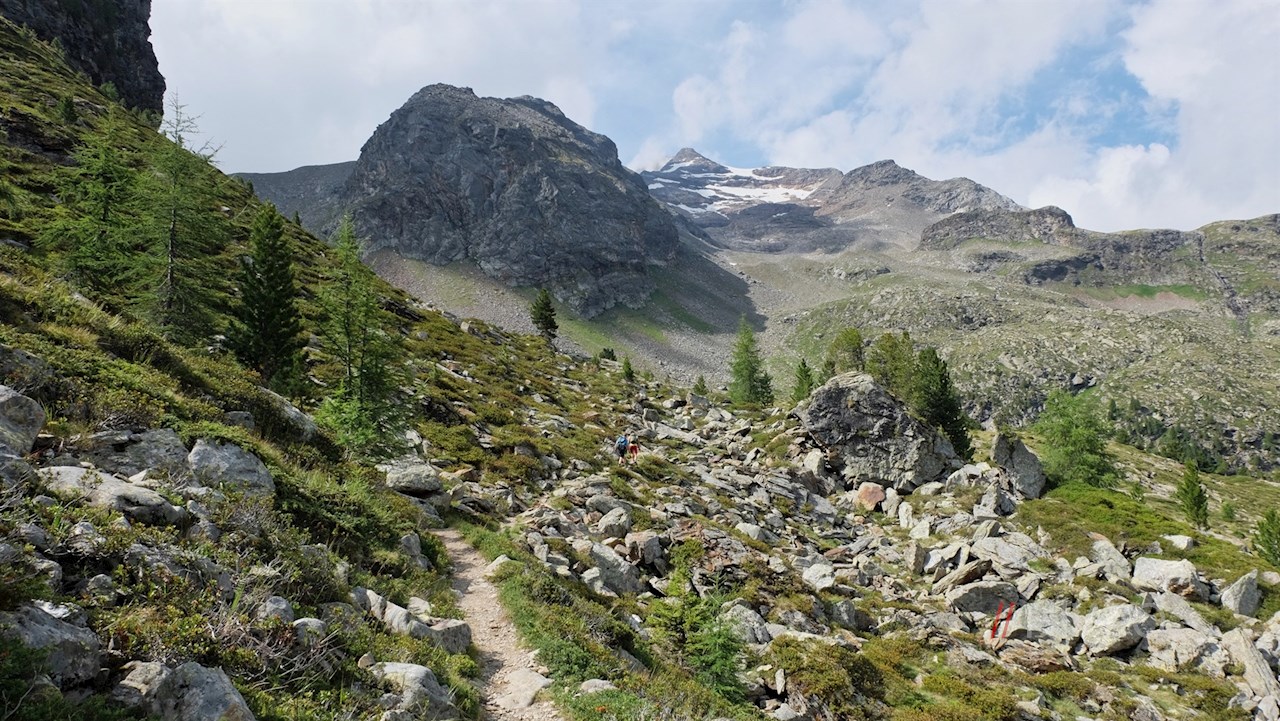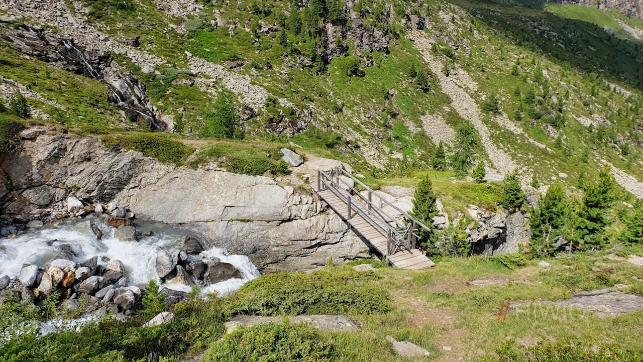 Hierfür schlägt man den rechts abzweigenden Wanderpfad Nr. 1A in Richtung Malersee ein. Er führt zunächst zu einem rauschenden Gletscherbach hinab, den man auf einer Holzbrücke überquert. Dahinter wandert man im sanften Anstieg über urwüchsige, steinbeschlagene Grashänge und ein Geröllfeld.