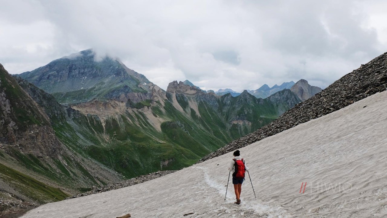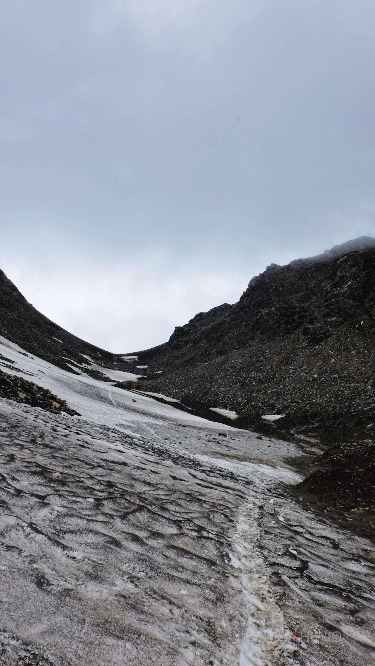 Wir aber steigen vom Joch über den Steig Nr. 17B durch Firn- und Schotterfelder zur Brixner Hütte ab.