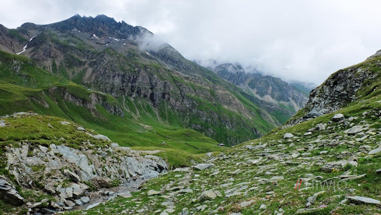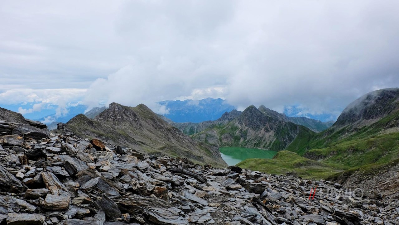 Vom 46 m tiefen Wilden See steigt der Weg Nr. 18 auf das Rauhtaljoch (2.800 m) an, zu dessen Linken sich die Wilde Kreuzspitze erhebt.