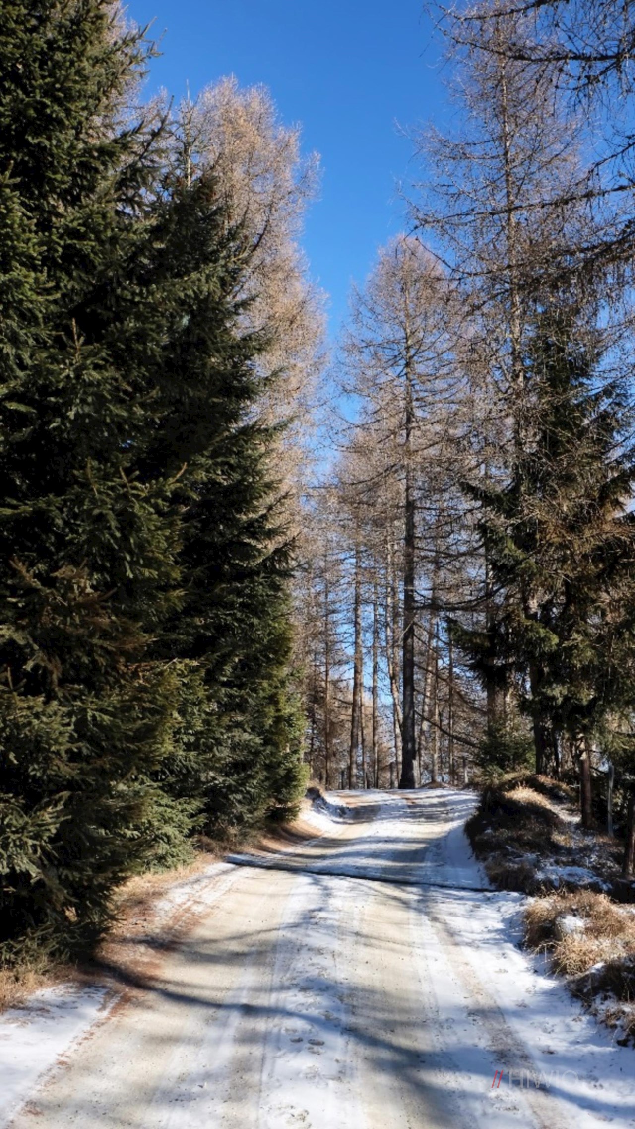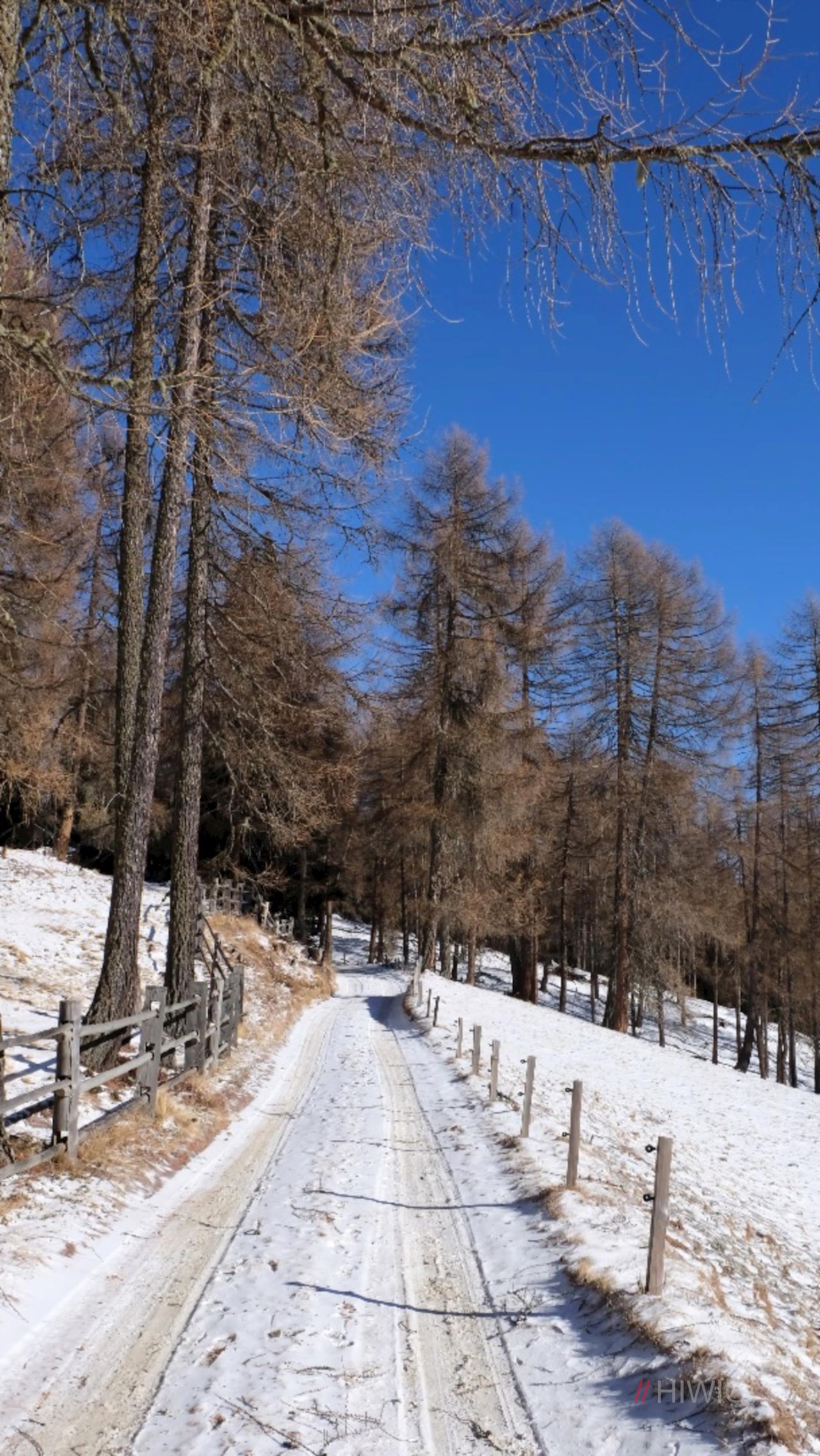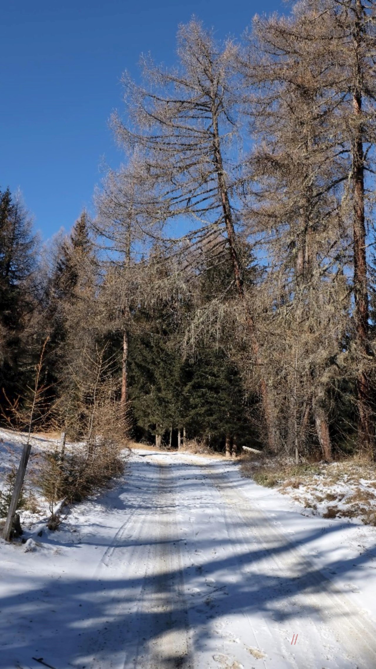 Stets der Markierung 9 folgend, führt ein breiter, gemächlich ansteigender Forstweg durch Wald und Lärchenwiesen, die immer wieder Blicke auf die Pfunderer Bergwelt freigeben.