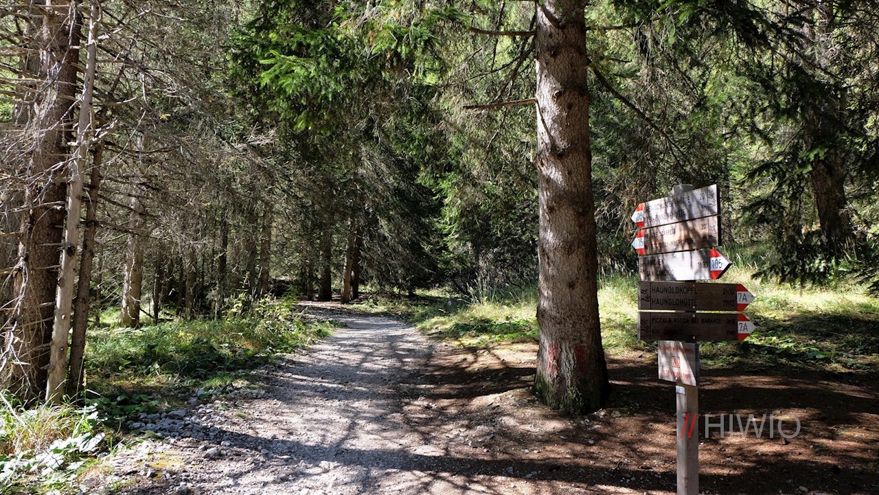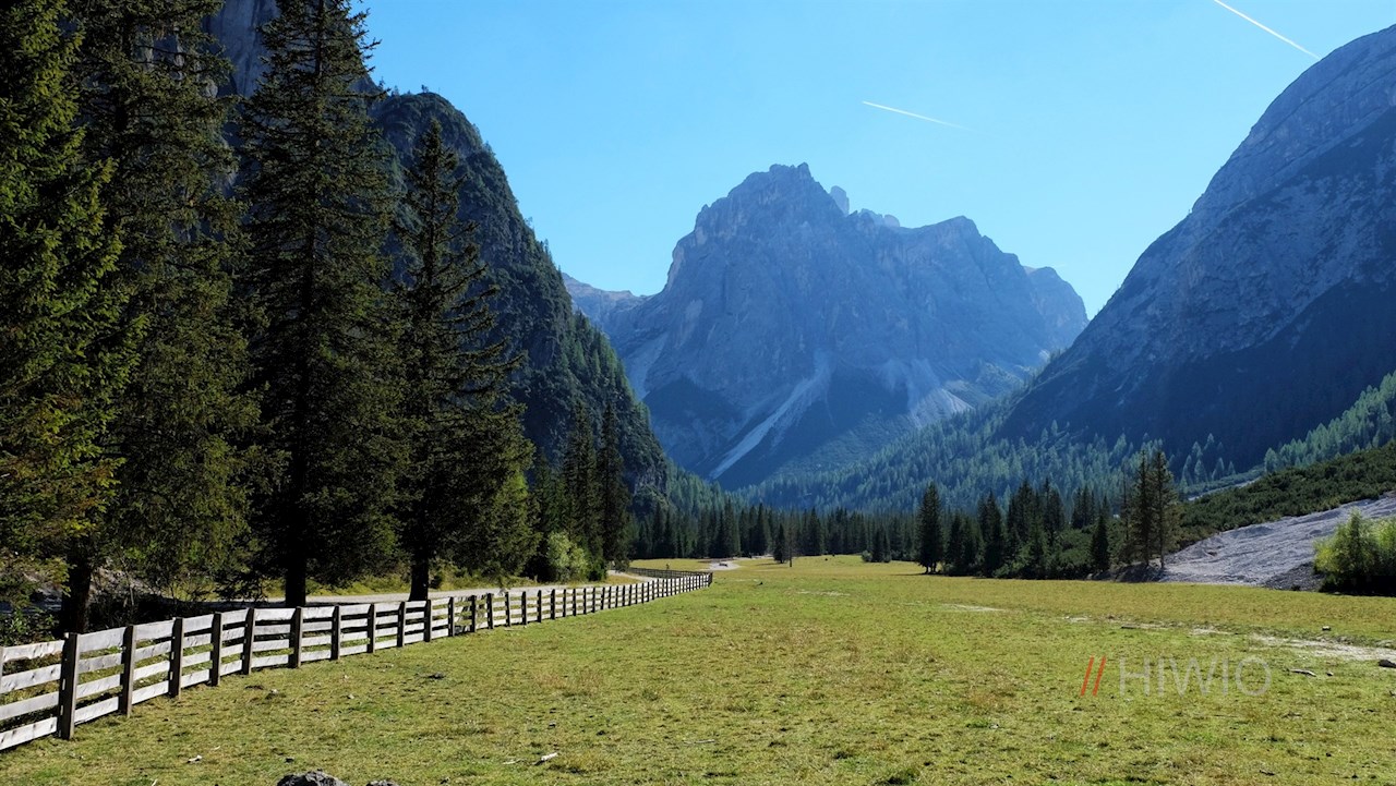 Den Wegweisern in Richtung Dreischusterhütte folgend, wandert man zunächst an der blumenfrohen, mit malerischen Lärchen bewachsenen Gwengwiese vorbei.