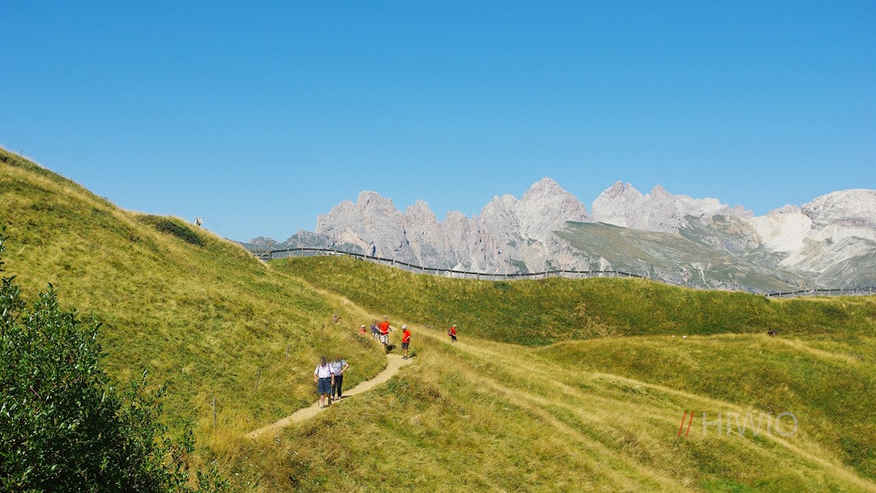 Der Beschilderung Nr. 526 in Richtung Emilio Comici Hütte folgend, führt der Weg zunächst nahezu eben durch die Bergwiesen am Fuße des Langkofel in Richtung „Steinerne Stadt“.