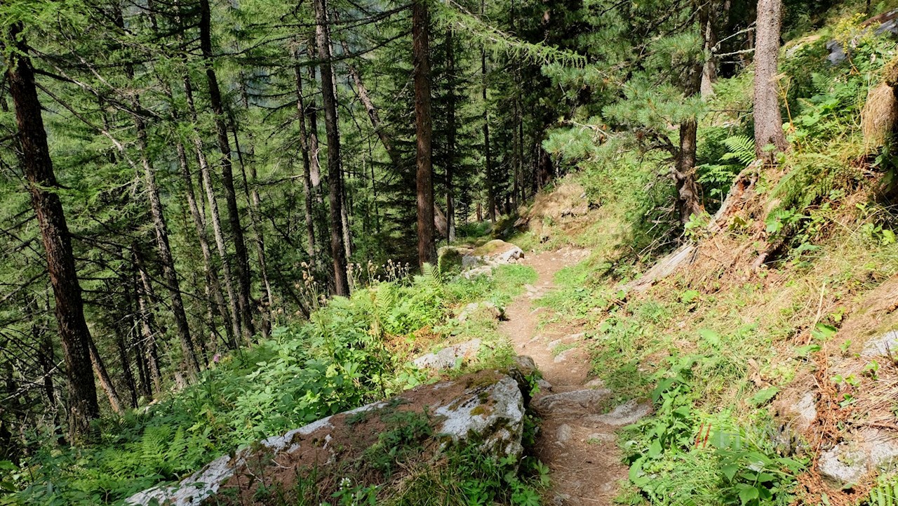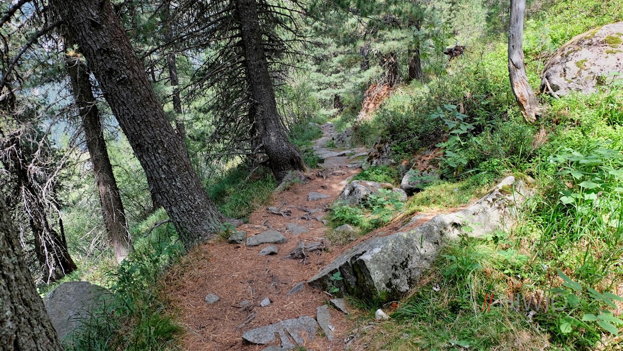 Wenig später geht der bislang ebene Weg in einen steinbeschlagenen, stetig ansteigenden Waldpfad über.