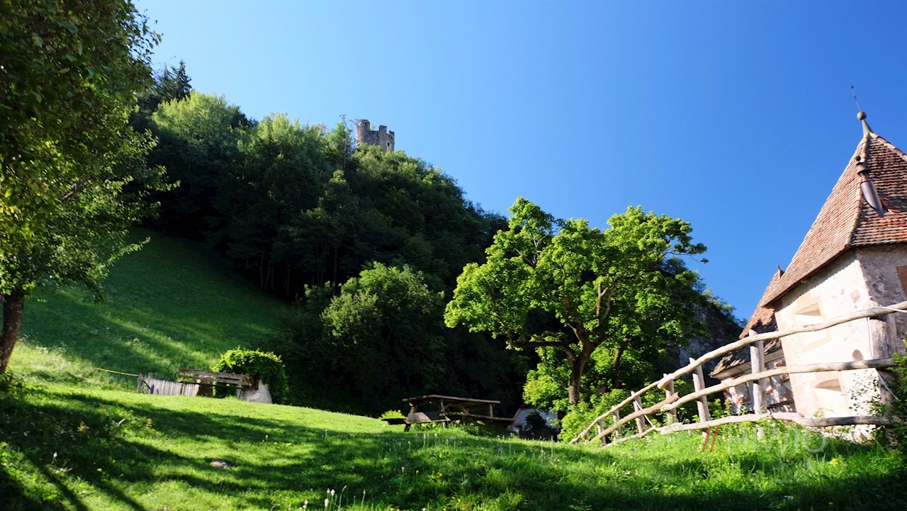 Im kurzen, aber stetigen Anstieg wandert man zunächst zwischen Häusern, dann durch Wiesen und einen kleinen Laubwald zur gleichnamigen Burg hoch.