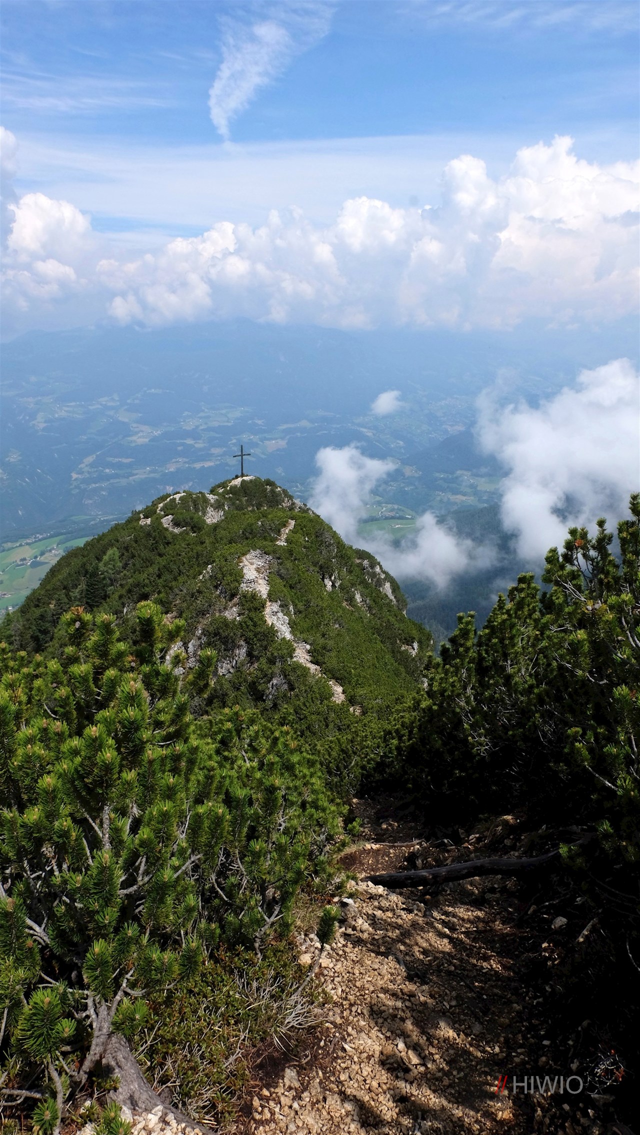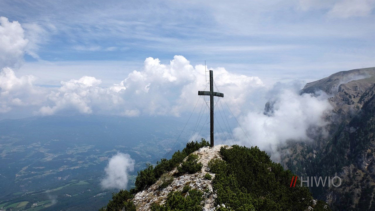 Stets den Wegweisern in Richtung Hammerwand folgend, erreicht man schließlich einen Vorgipfel. Hier tun sich im wahrsten Sinne des Wortes schwindelerregende Ausblicke nach unten und eine malerische Sicht auf den gegenüberliegenden Schlern auf. Auch das Gipfelkreuz der Hammerwand ist bereits in Sicht, zu dem sich der Pfad durch felsiges, latschenbewachsenes Gelände seinen Weg bahnt.