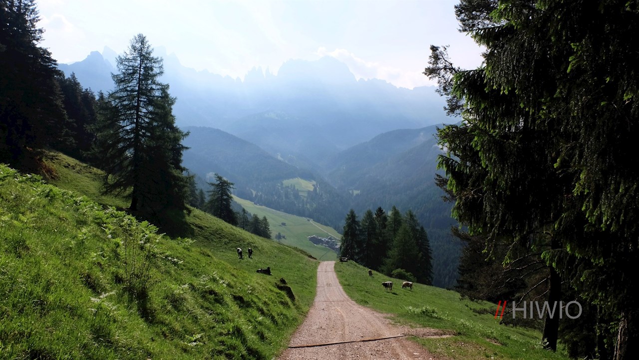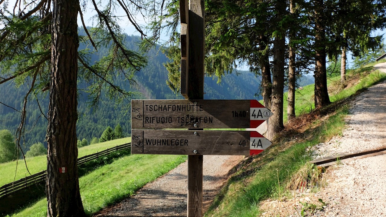 Hier schlägt man den Weg Nr. 4A in Richtung Tschafonhütte ein. Er führt im zunächst gemächlichen Anstieg zum sog. „Wuhnleger“, einer Bergwiese mit Blick auf den Latemar und den in der Dämmerung leuchtenden Rosengarten.