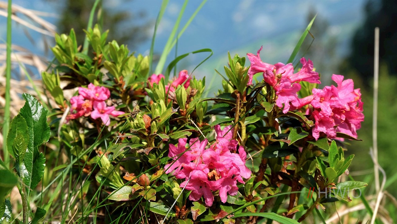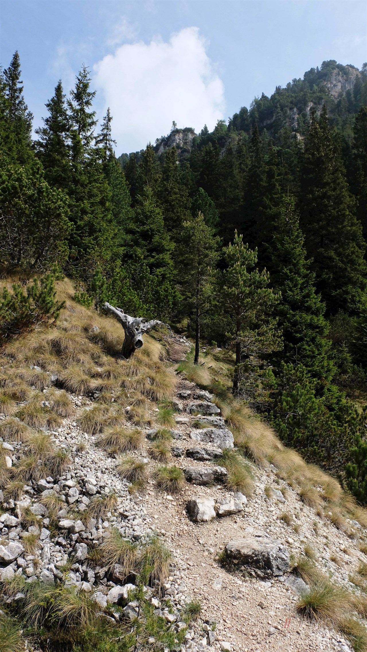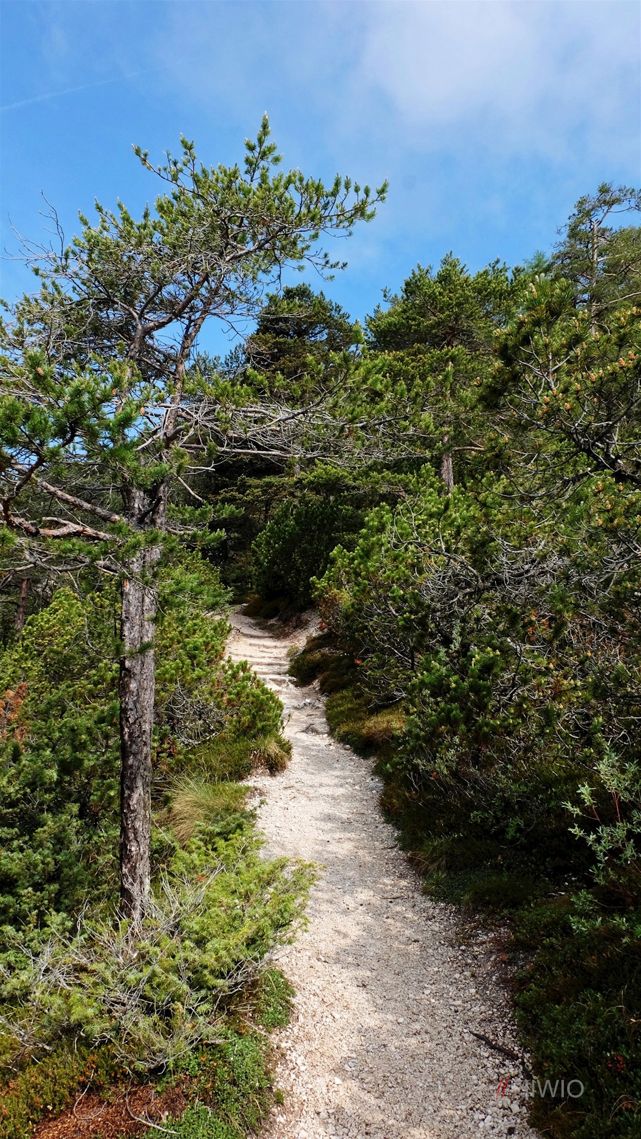 Kurz vor der Hütte zweigt rechts der breite Weg Nr. 9 ab. Er schlängelt sich zunächst nahezu eben in Richtung Hammerwand und geht alsbald in einen schmaleren Pfad über. Zwischen Alpenrosen und Latschenkiefern windet sich dieser ziemlich steil nach oben.