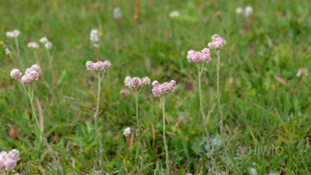 An der nächsten Weggabelung zweigt er erneut links ab und führt über einen sanften, nunmehr schmaleren Pfad über die steil abfallenden, von Zwergsträuchern und bunten Alpenblumen bewachsenen Grashänge.