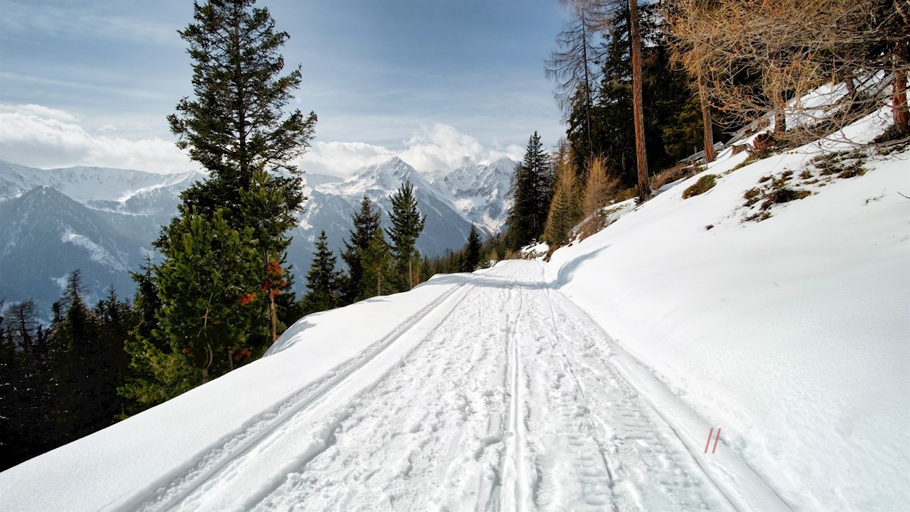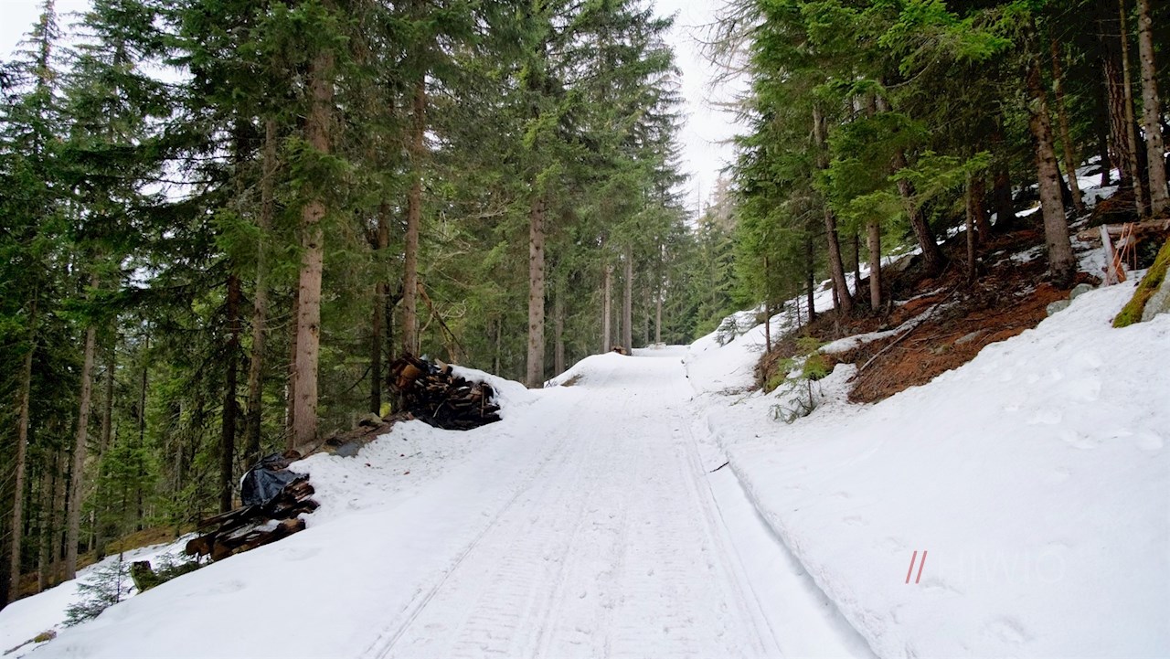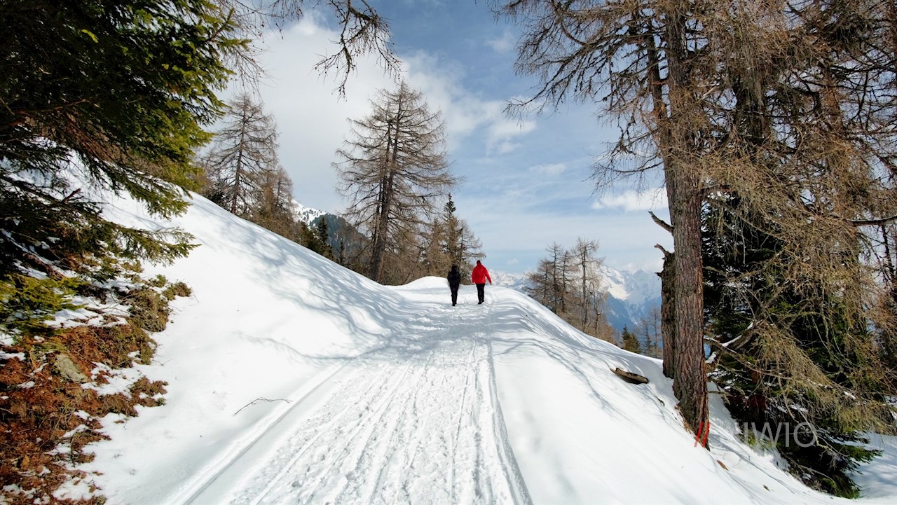 Dem breiten Forstweg in Richtung Weizgruberalm folgend, taucht man sogleich in einen friedvollen Nadelwald ein. Er zieht sich in angenehmer Steigung durch die stille, schneeverhangene Natur zum oberen Waldrand.