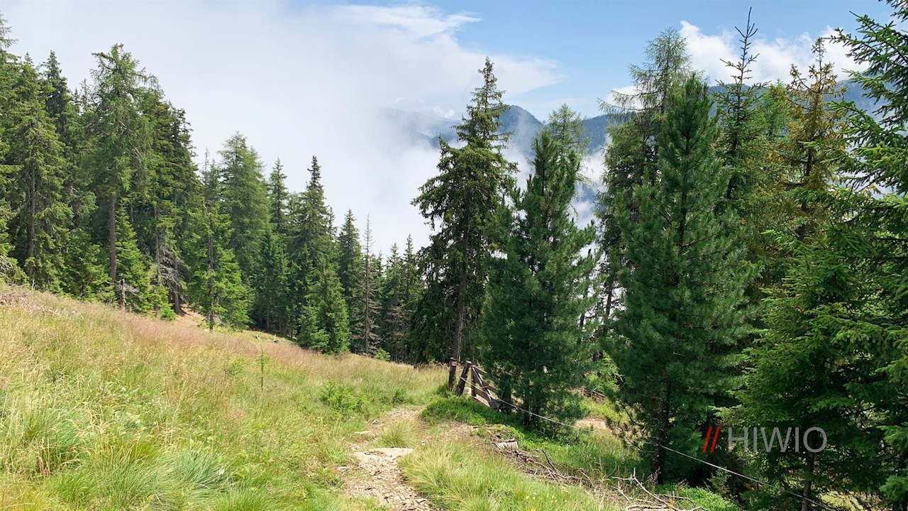 Stets der Wegnummer 28A folgend, kann man entweder auf dem breiten, sanfter ansteigenden Forstweg oder auf dem steileren Waldsteig zu den wiesenumrahmten Almhütten unterhalb der Weizgruberalm hochwandern, bei denen sich bereits ein malerischer Ausblick auf die gegenüberliegende Bergwelt öffnet.