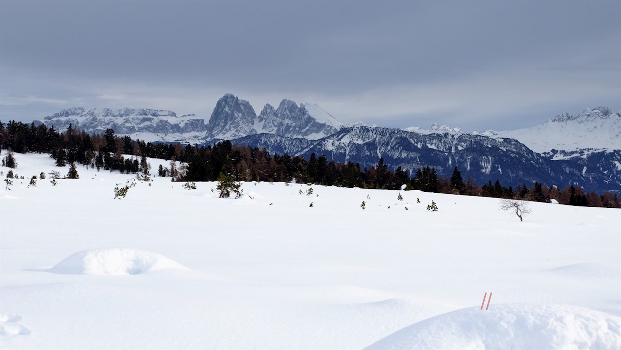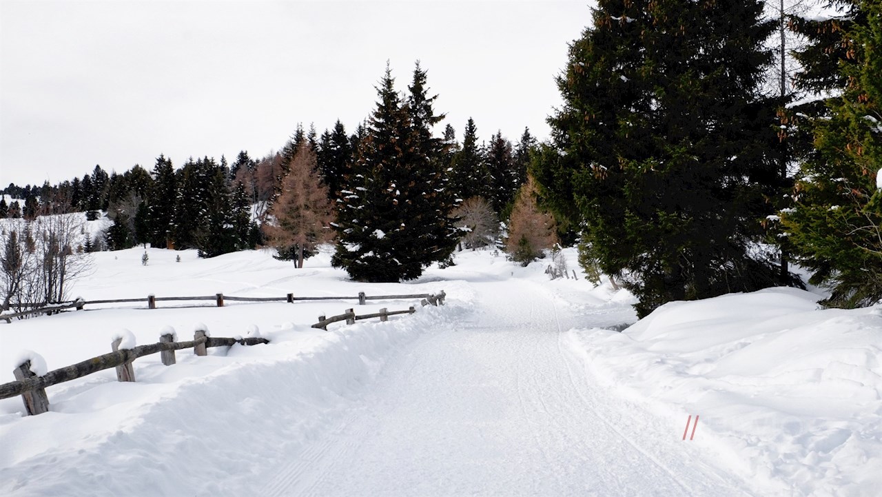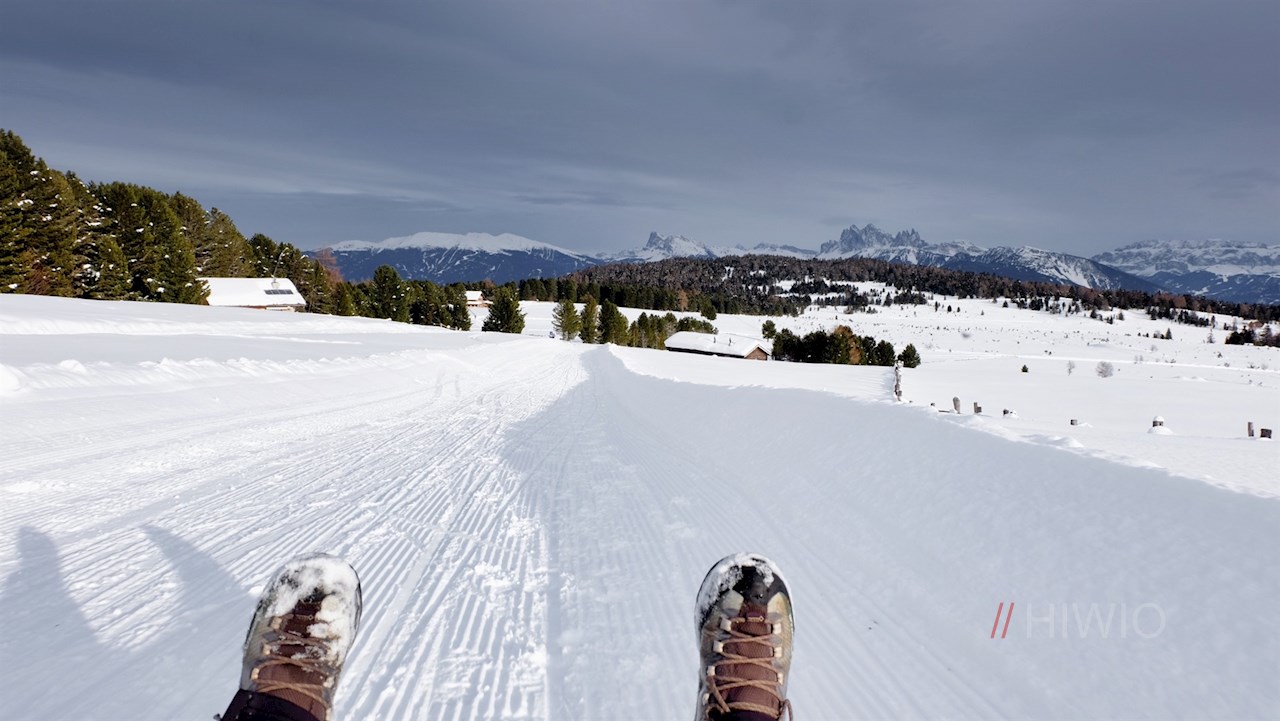 Kurz vor der Moar in Plun Hütte zweigt der Verbindungsweg zu gleich zwei kurzen Rodelbahnen ab. Knapp 100 m später wählen wir die links abzweigende Rodelbahn und gleiten mit Blick auf die Plose, den Peitlerkofel und die Geislerspitzen zur nahen Rinderplatz Hütte hinab.
