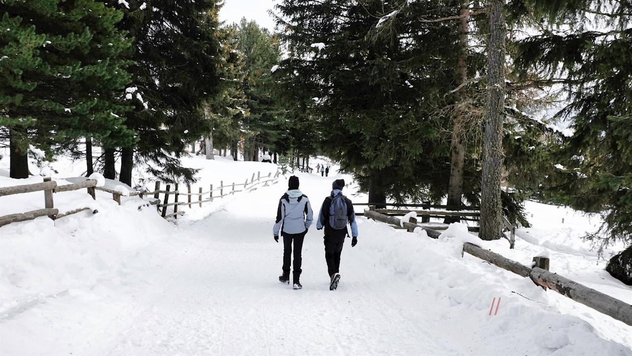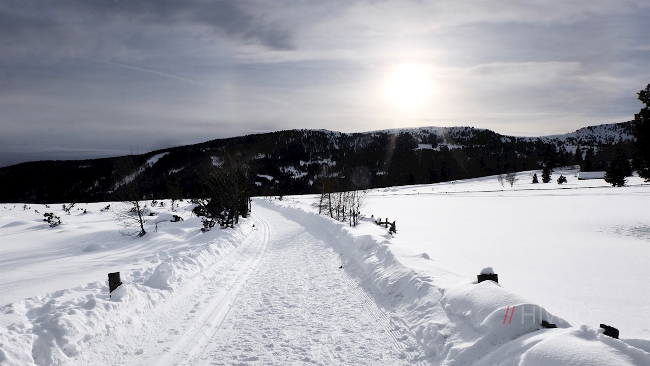 Nahe der Gasserhütte zweigt der breite Winterwanderweg Nr. 6 ab. Er führt im sanften Anstieg durch die baumbestandenen Almwiesen, die im Winter unter einer glitzernden Schneedecke verborgen liegen.