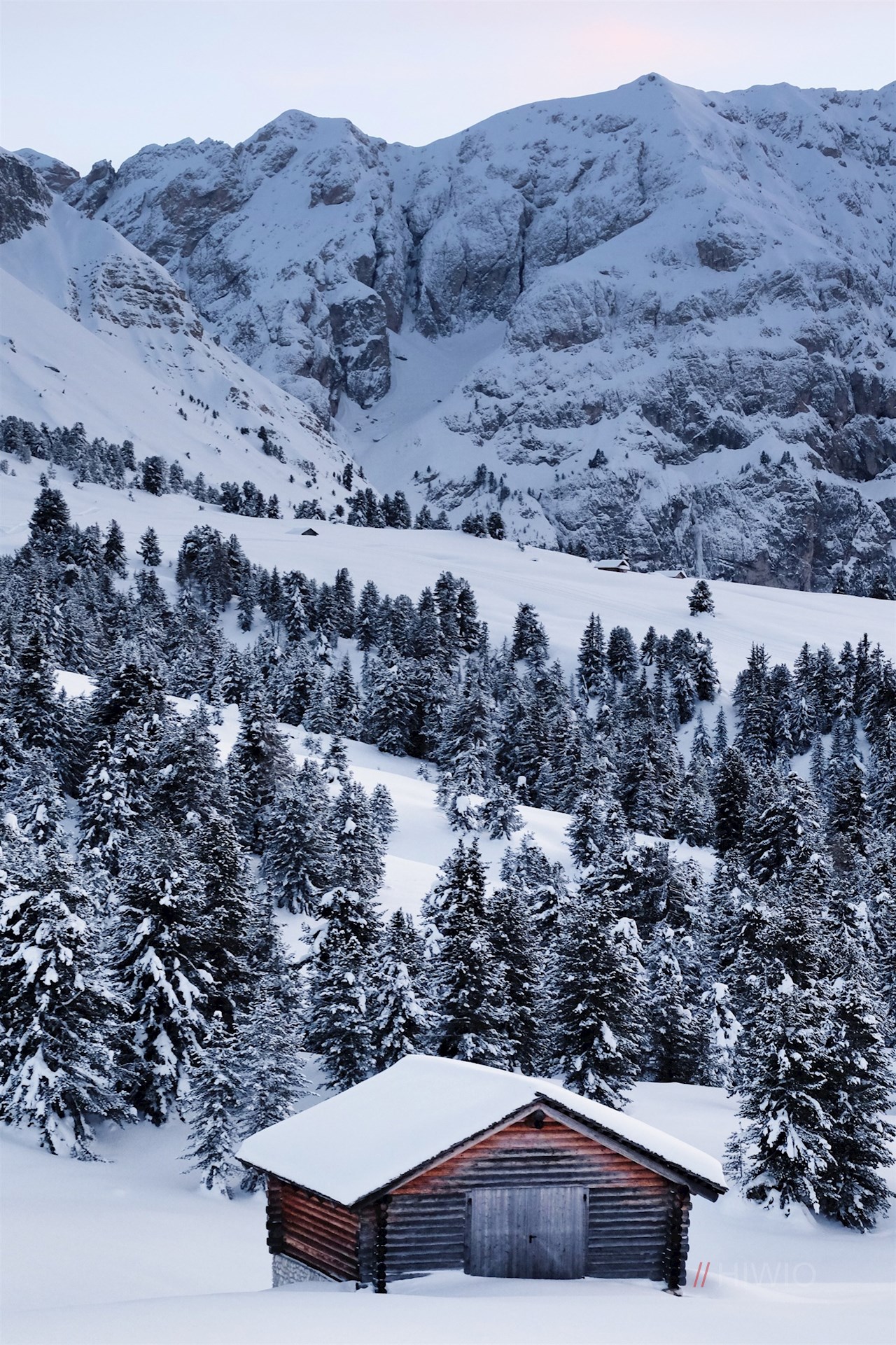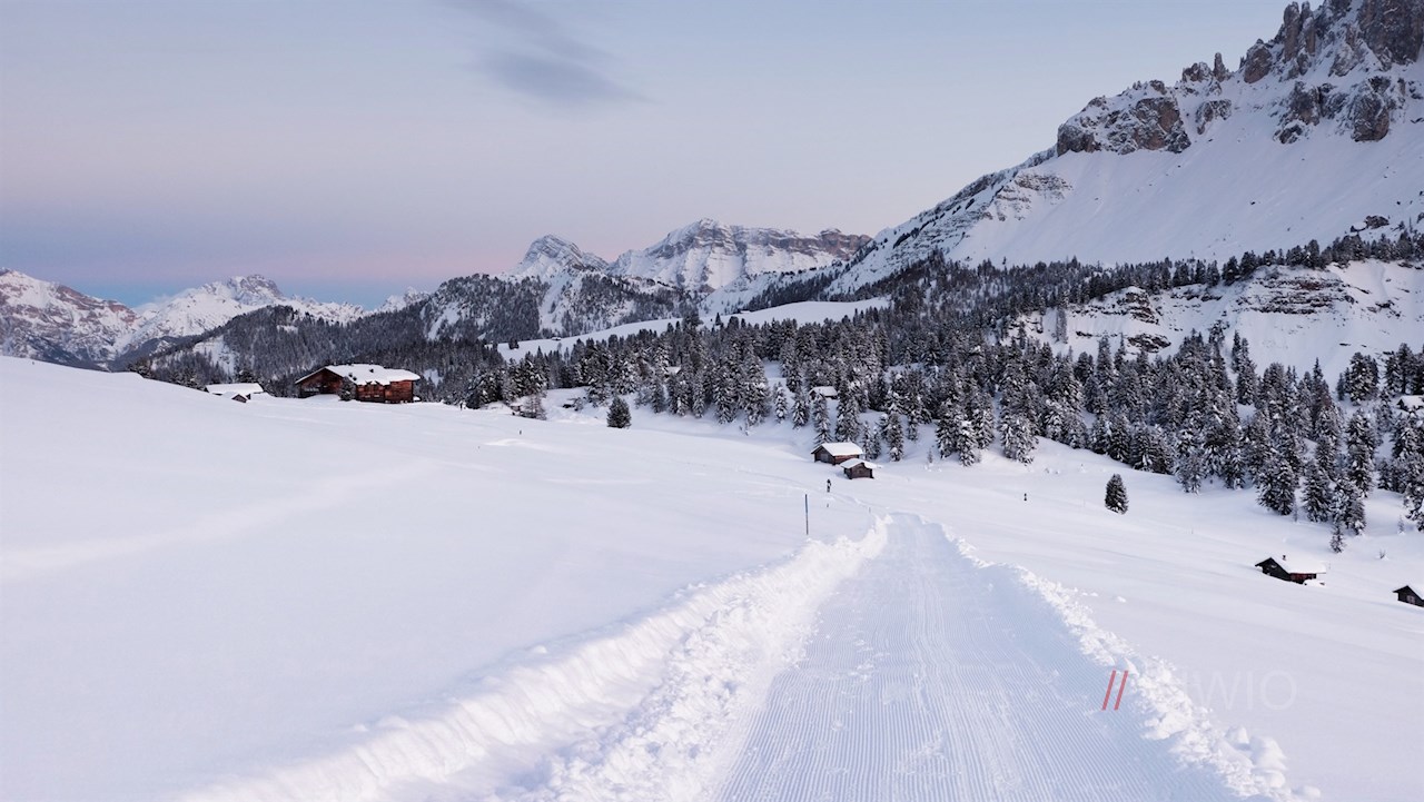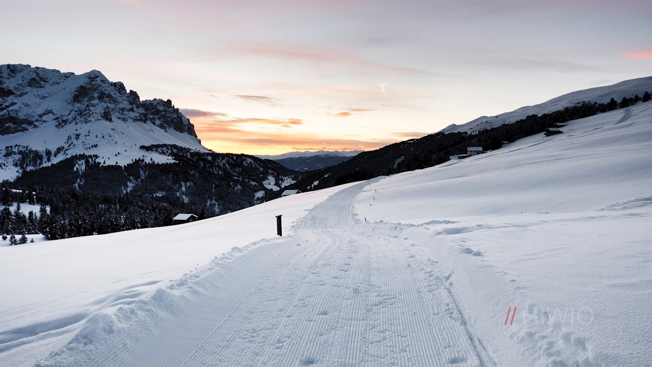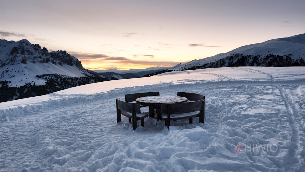 Vor der malerischen Kulisse der Gadertaler Dolomiten steigt der Winterwanderweg nun in einem weiten Bogen zur Würzjochhütte ab, in der den Wanderer auch im Winter genussreiche Momente in gemütlicher Atmosphäre erwarten (geöffnet von Weihnachten bis Ende März; Stand 2020).