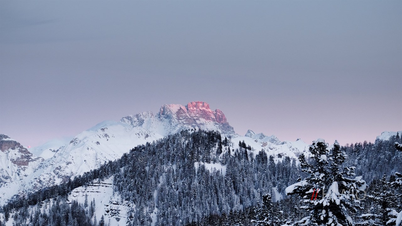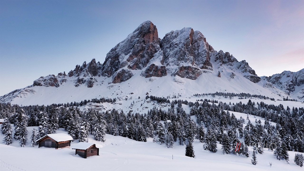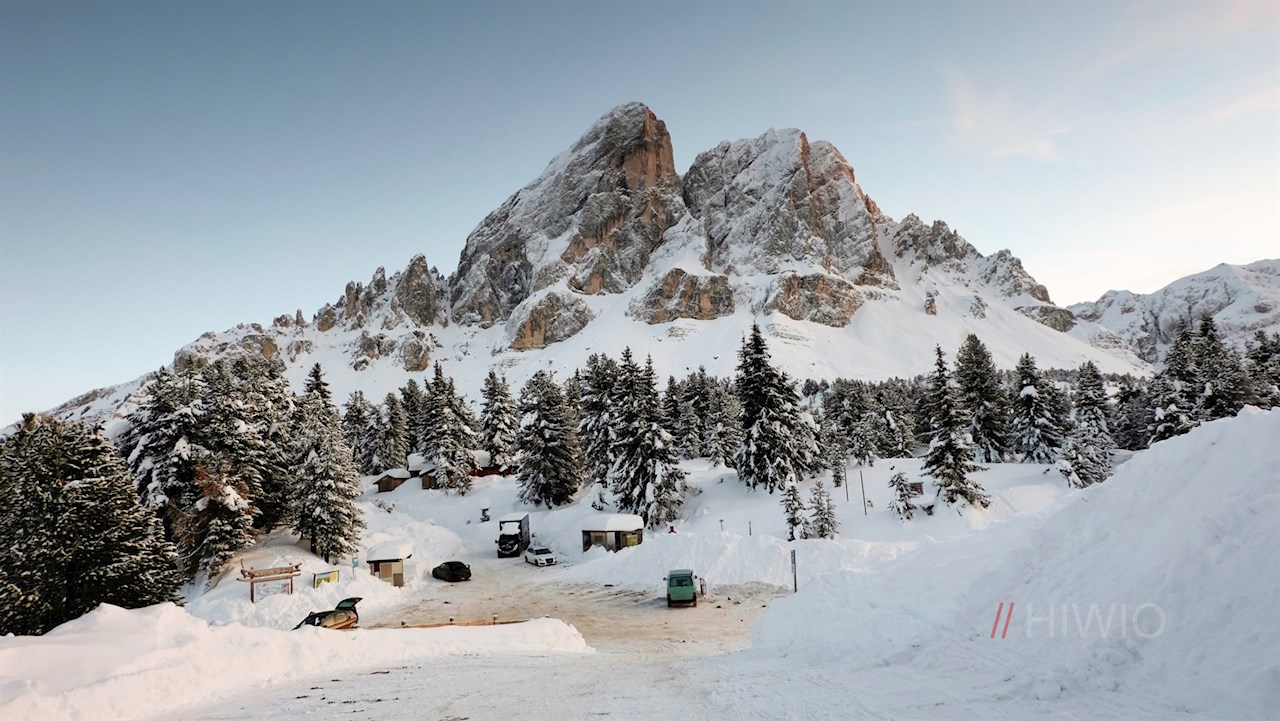 Links der Würzjochhütte zweigt der gebahnte Winterwanderweg ab. Mit faszinierendem Nahblick auf die schneebedeckten Felswände des Peitlerkofel und der benachbarten Aferer Geisler führt er im angenehmen Anstieg durch die bezaubernde Winterlandschaft.
