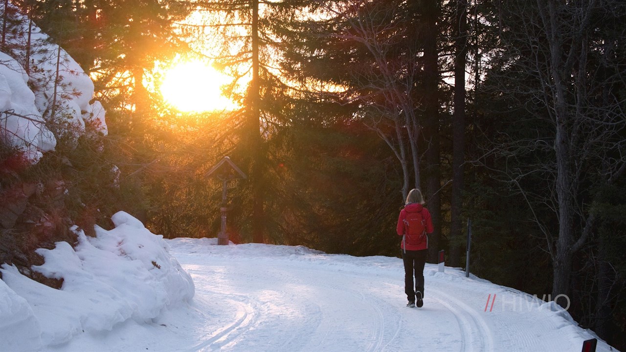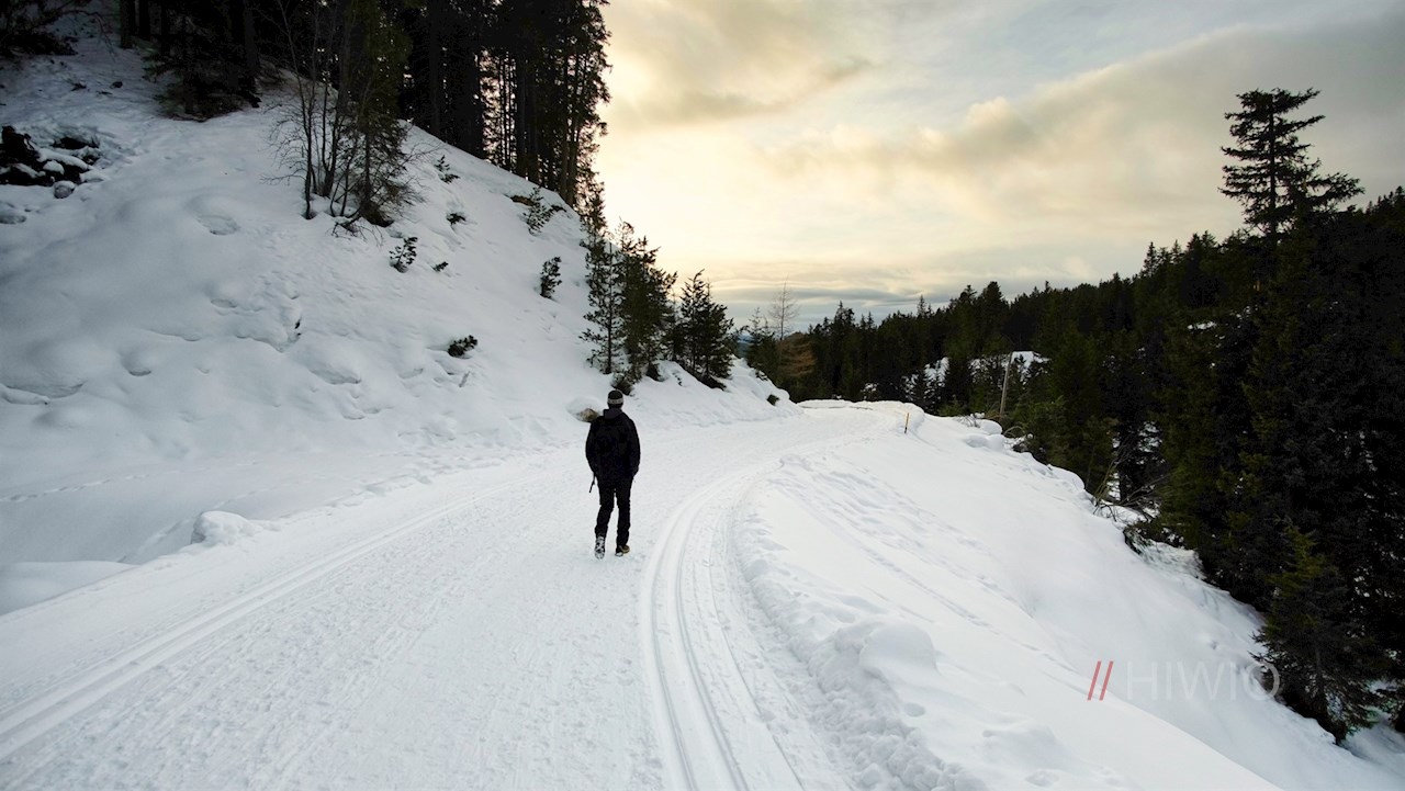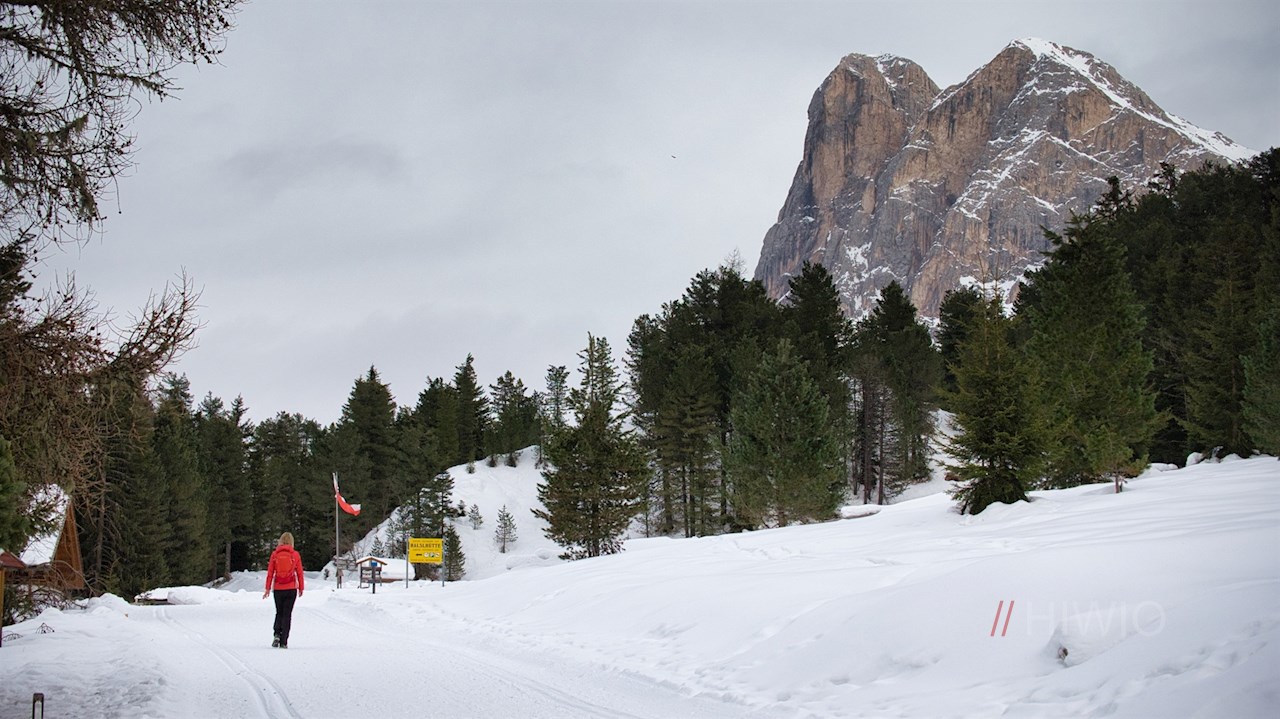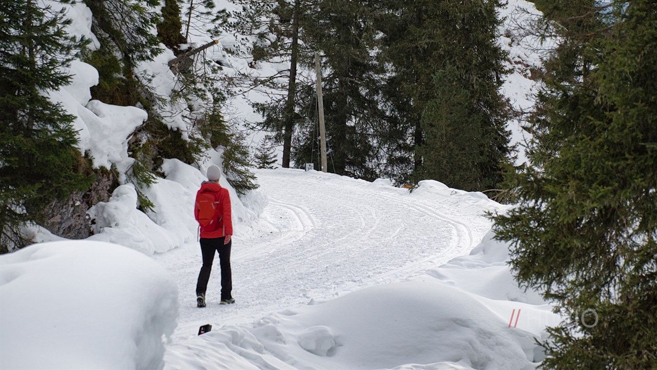 Vom Parkplatz folgt man der Würzjochstraße, die sich in der kalten Jahreszeit in einen präparierten Winterwanderweg samt Langlaufloipe verwandelt. Er schlängelt sich sanft, aber stetig durch die bezaubernde Winterlandschaft in Richtung Halslhütte.