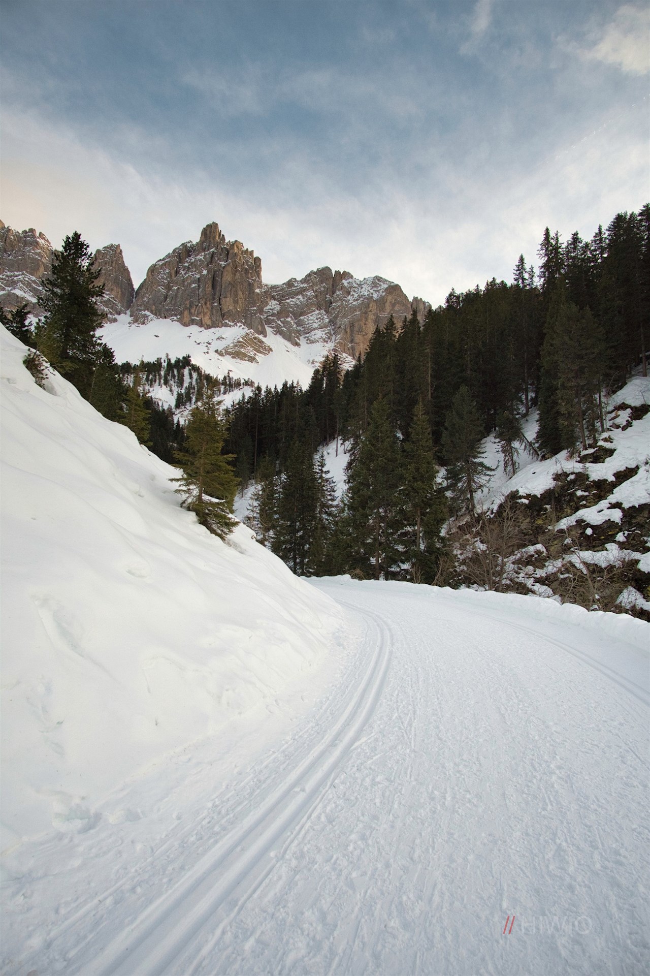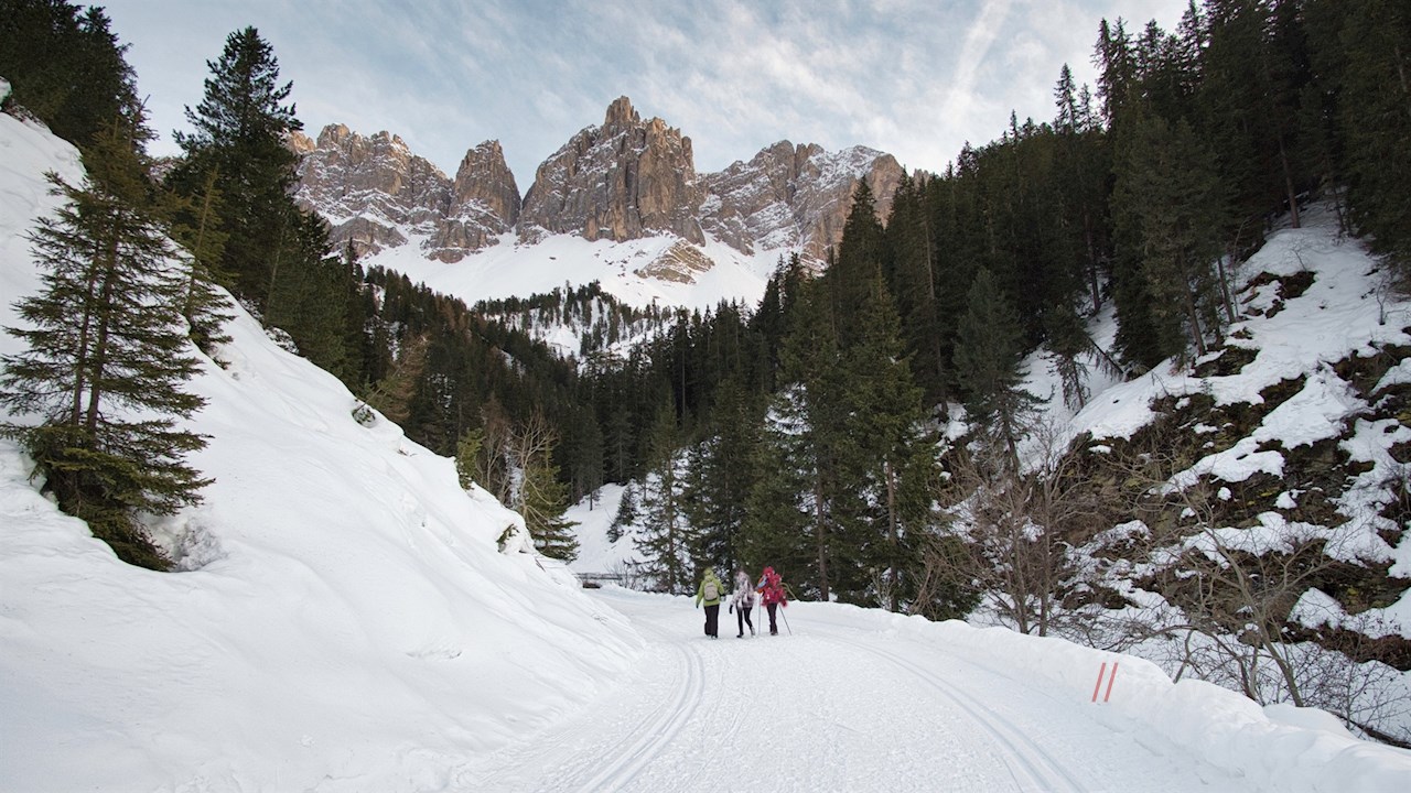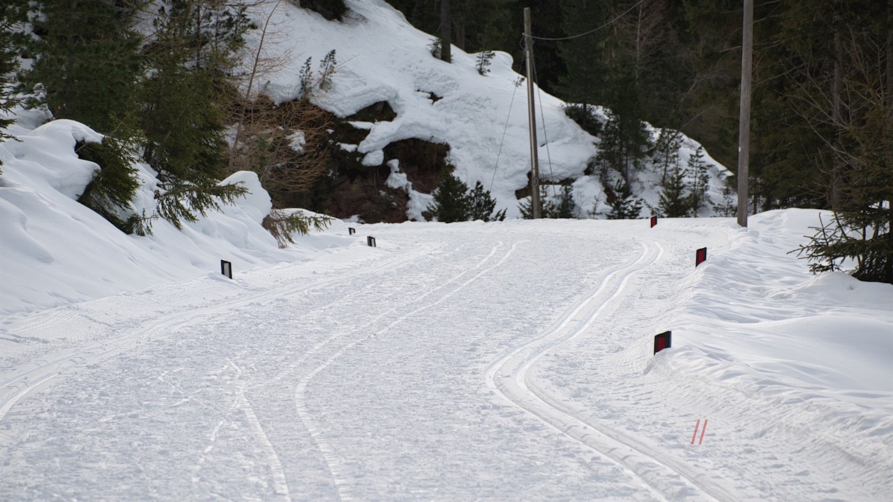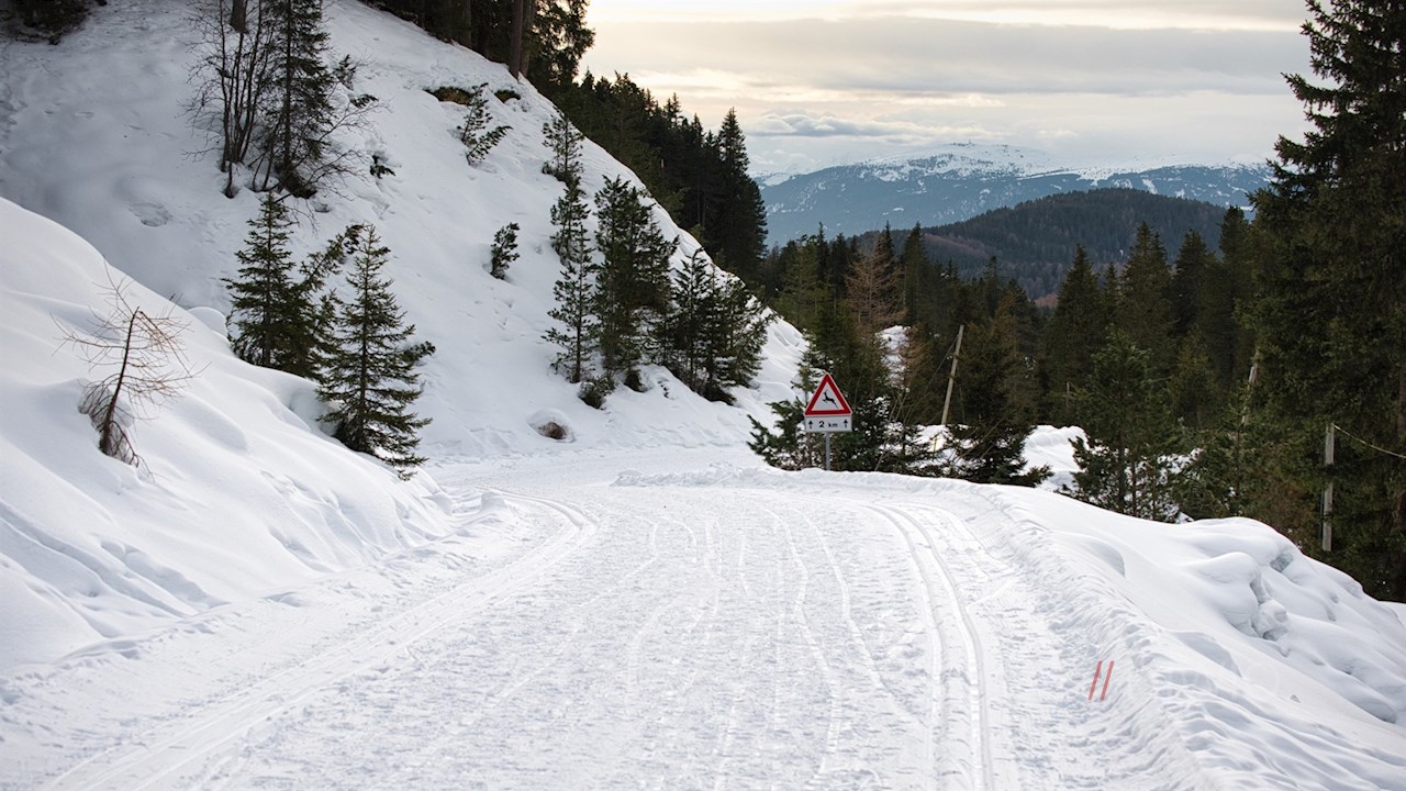 Vom Parkplatz folgt man der Würzjochstraße, die sich in der kalten Jahreszeit in einen präparierten Winterwanderweg samt Langlaufloipe verwandelt. Er schlängelt sich sanft, aber stetig durch die bezaubernde Winterlandschaft in Richtung Halslhütte.