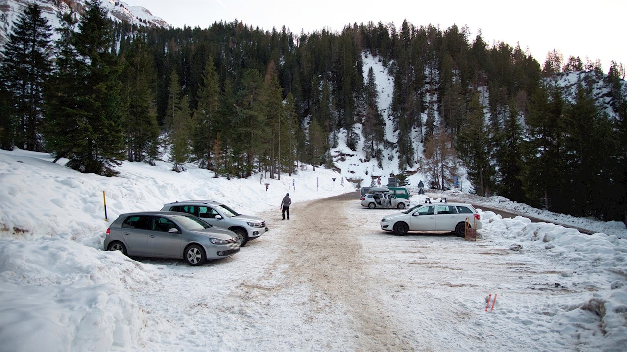 Die hier beschriebene Winterwanderung zur Halslhütte nimmt am Wanderparkplatz bei der Russisbrücke ihren Anfang (Anfahrt über Brixen/Afers oder Villnöss/Coll).